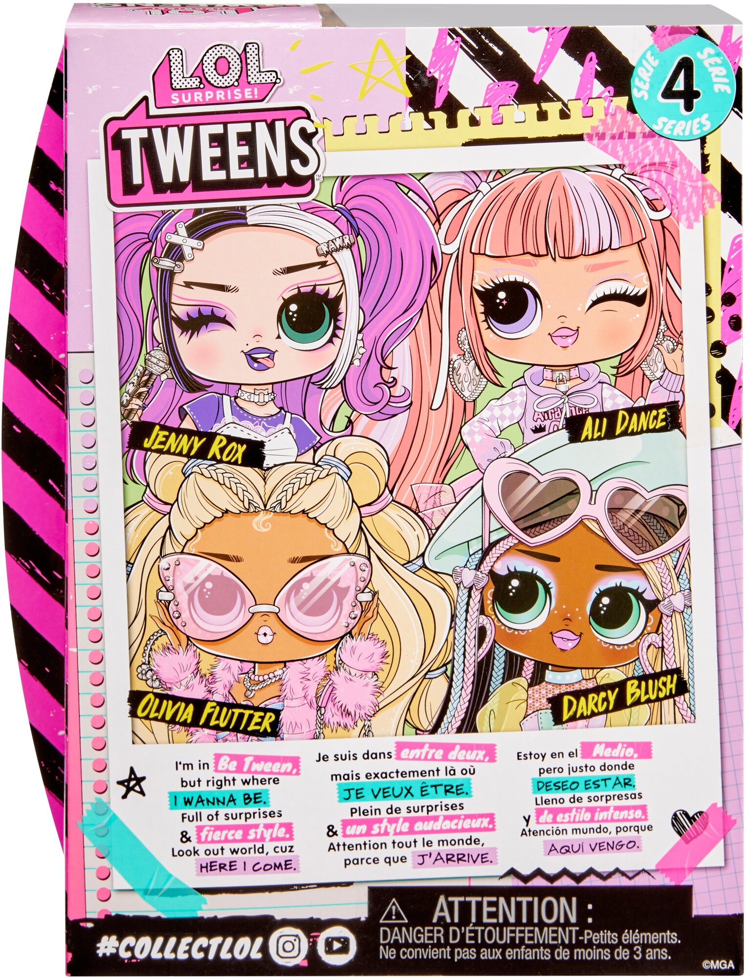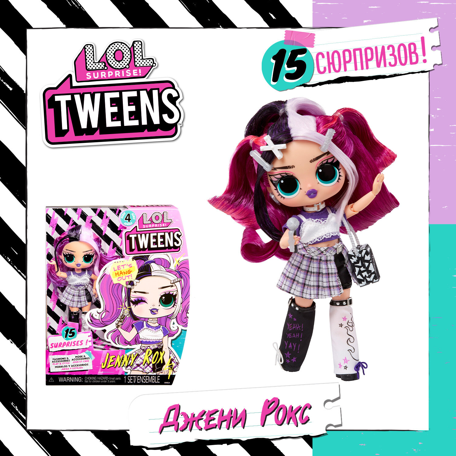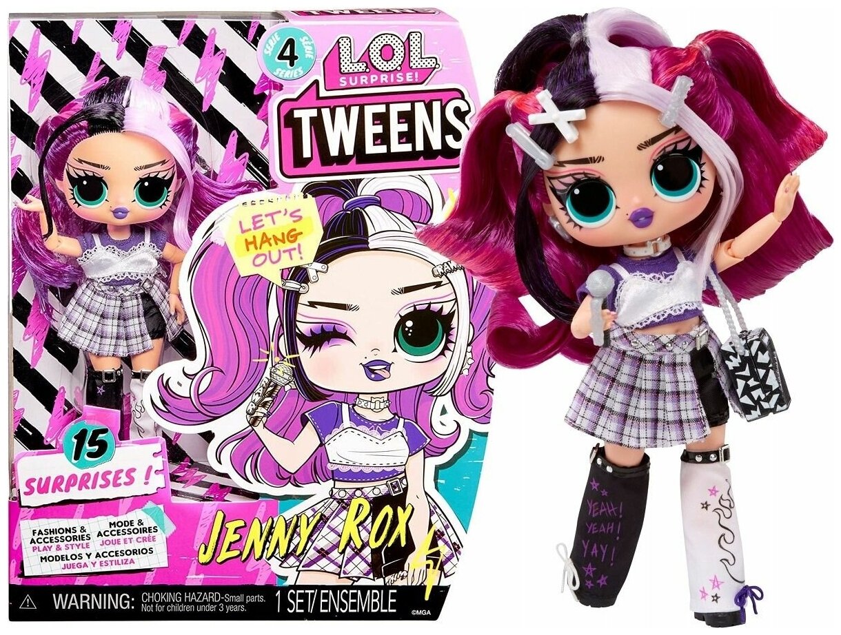 Серия Tweens (от слова Between (между)) - это куколки ростом 16см. Дженни Рокс обладает потрясающими чертами лица, красивыми волосами, собственным потрясающим нарядом и готова к множеству возможностей для позирования.Оденьте Дженни Рокс в ее единственную в своем роде одежду и аксессуары, чтобы продемонстрировать ее стиль рок-звезды, включая стильные гетры, модные клетчатые шорты и шикарный многослойный топ! Совет: руки снимаются для удобства одевания.РАСПАКУЙТЕ 15 СЮРПРИЗОВ, включая модную куклу, одежду, обувь, аксессуары, заколки для волос, серьги, ожерелье, сумочку, микрофон, расческу и подставку для куклы.Лучшие подруги 4ой серии: Дженни Рокс, Али Дэнс, Оливия Флаттер и Дарси Блаш!