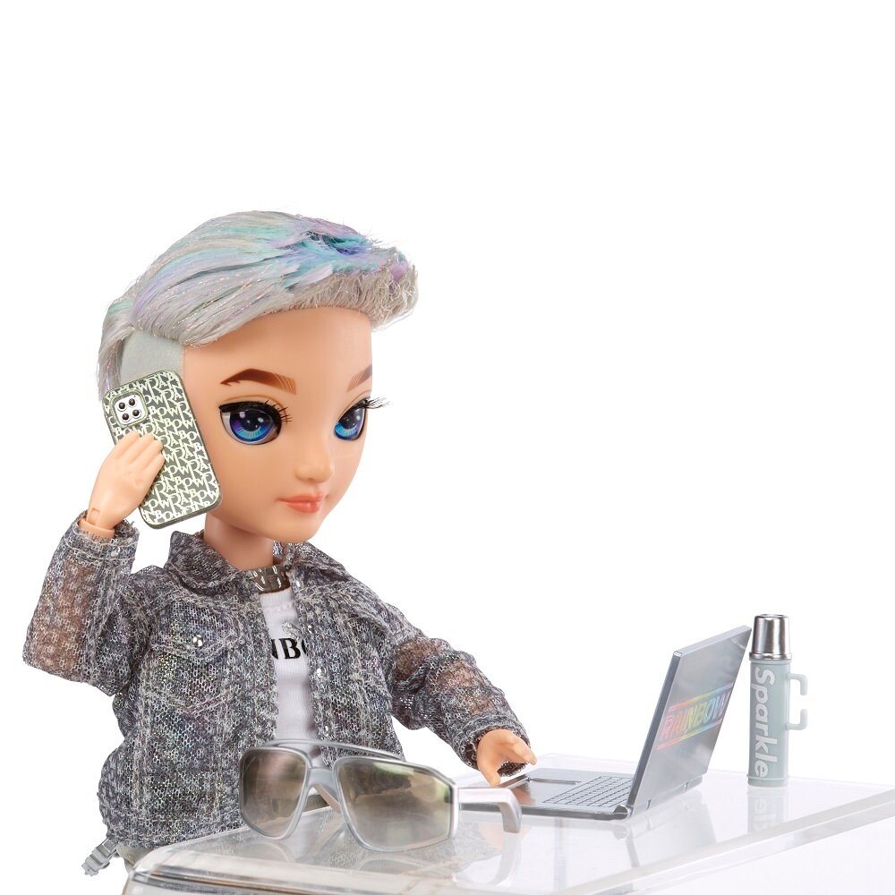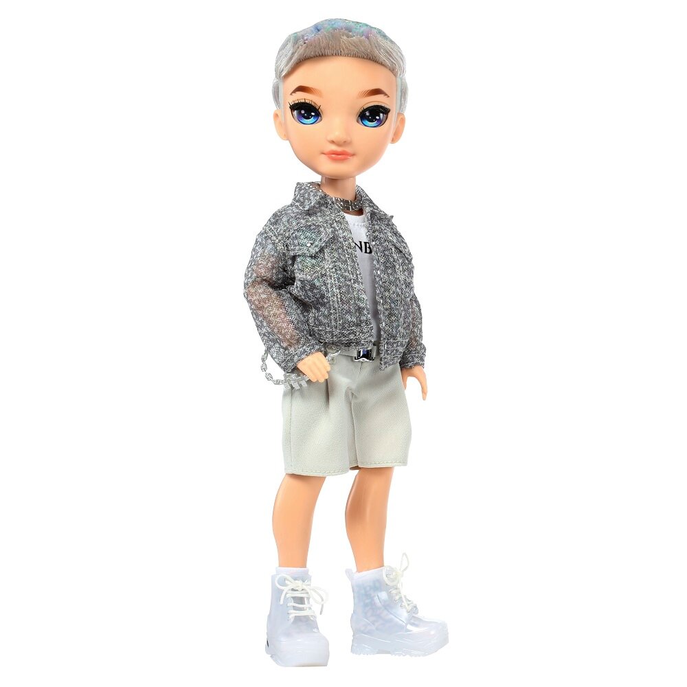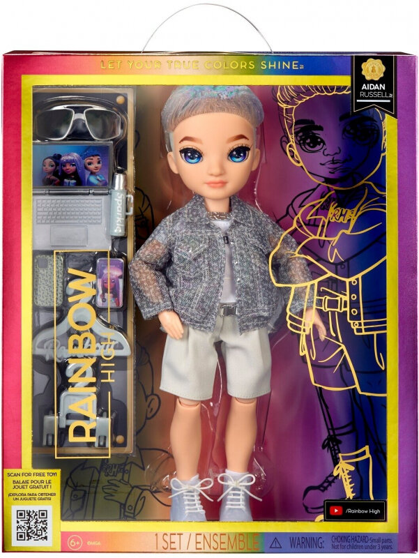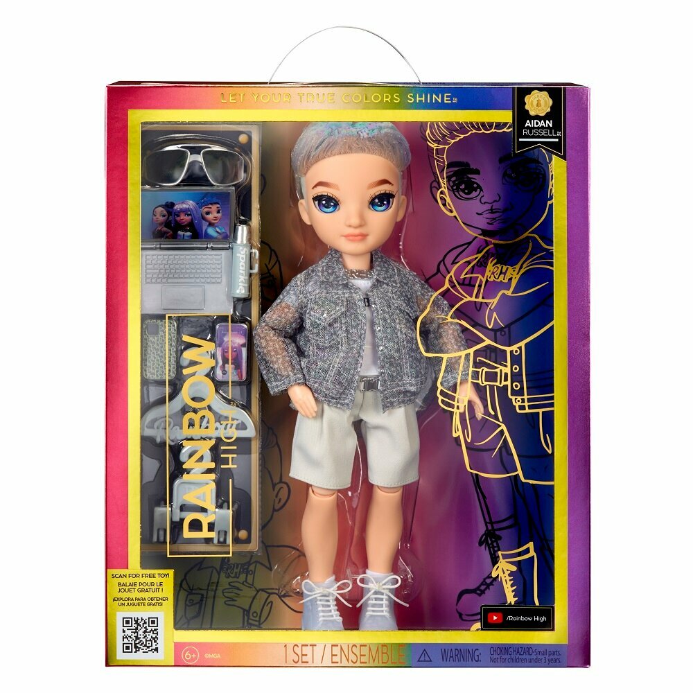 Рейнбоу Хай – это модные куклы премиального качества с детально проработанными аксессуарами. Познакомься со студентом школы Рейнбоу Хай Эйданом Расселом. Он не только красивый мальчик, но и талантливый музыкант, который создал группу со своими одноклассницами.Собери всех героев Рейнбоу Хай!Эйдан Рассел - это кукла высотой 28 см с густыми прошитыми волосами и длинными ресницами. У куклы подвижные ручки и ножки, включая локти, кисти и колени (11 точек артикуляции). В наборе: модная кукла, 1 комплект одежды и обуви, украшение, мобильный телефон, чехол для мобильного телефона, ноутбук, очки, термос, расческа, вешалки для одежды куклы, подставка для куклы. Игрушка изготовлена из полимерных и текстильных материалов. Товар сертифицирован и безопасен для детского использования. Упаковка: коробка с окном 30х25х8 см.