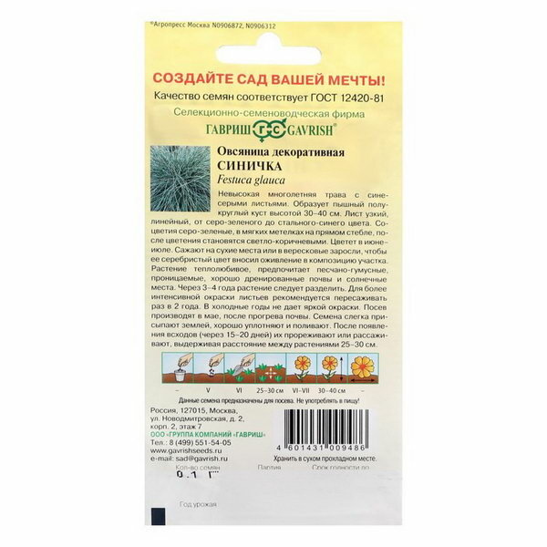 Вес упаковки — 0.1 г, производитель — Гавриш, страна продавца — Россия. Вид семян — овсяница, модель — Ледниковая Синичка.