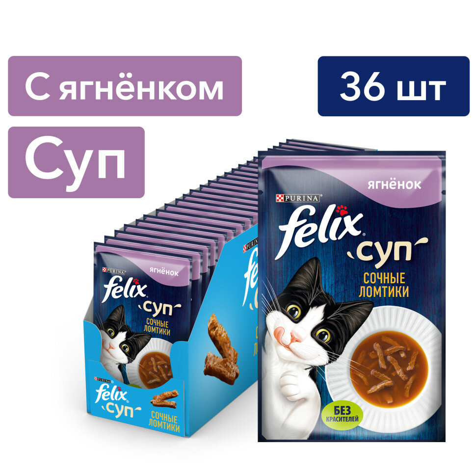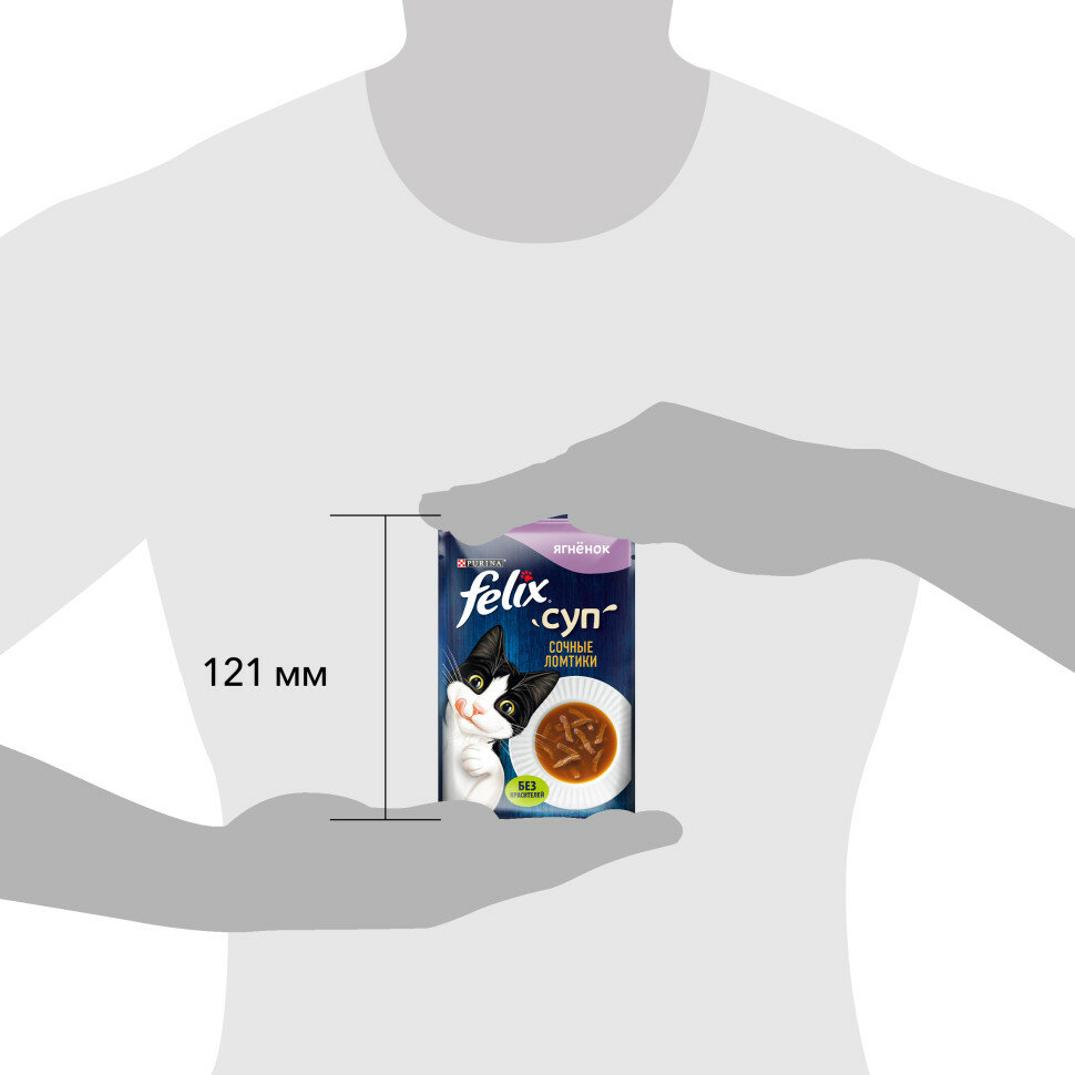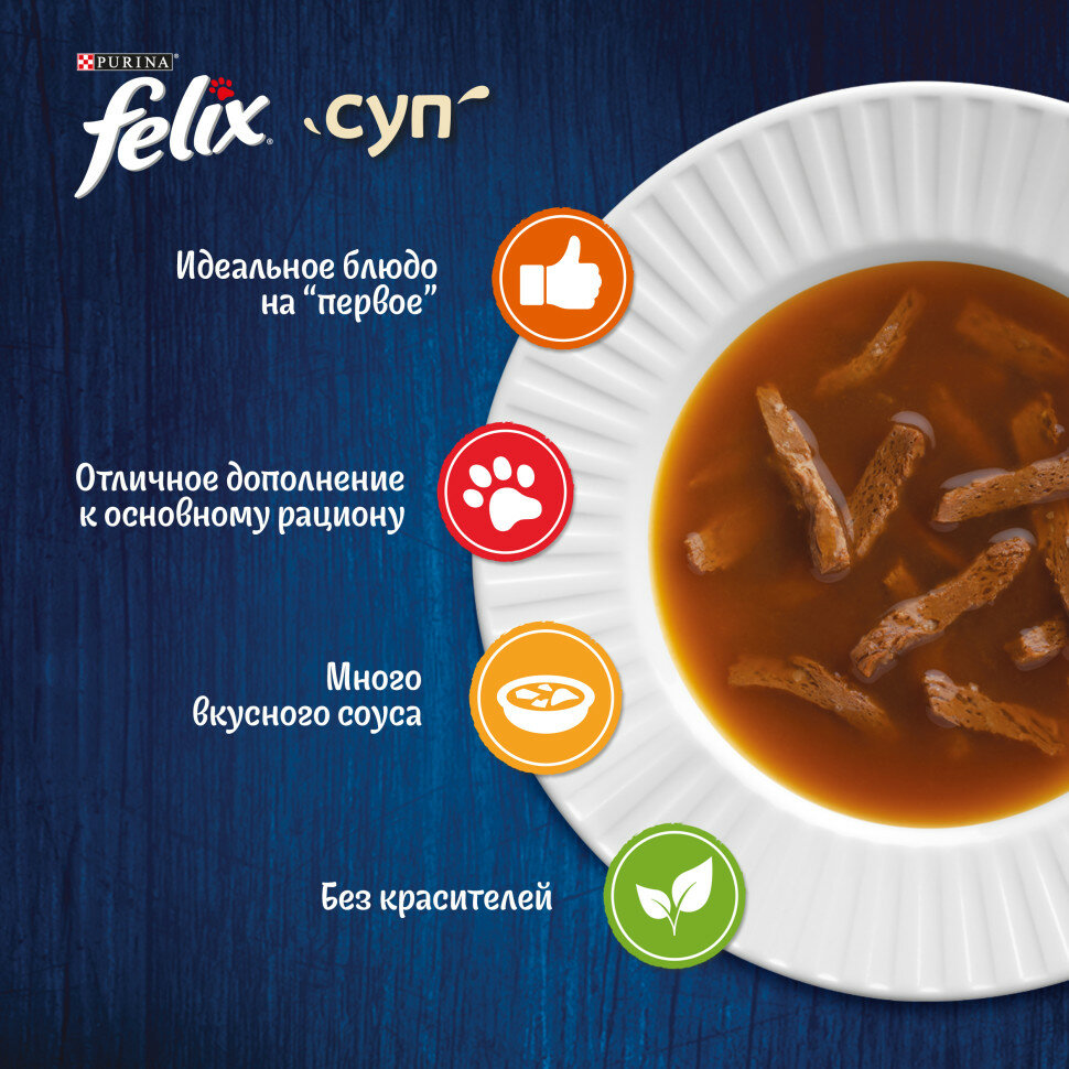 FELIX Суп. Сочные Ломтики - вкусное дополнение к ежедневному рациону, которое внесет разнообразие в питание Вашего любителя вкуснятины! Он по достоинству оценит нежные тонко нарезанные ломтики в большом количестве ароматного бульона!