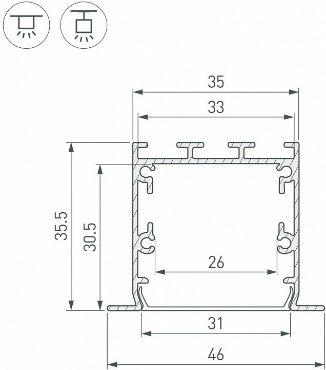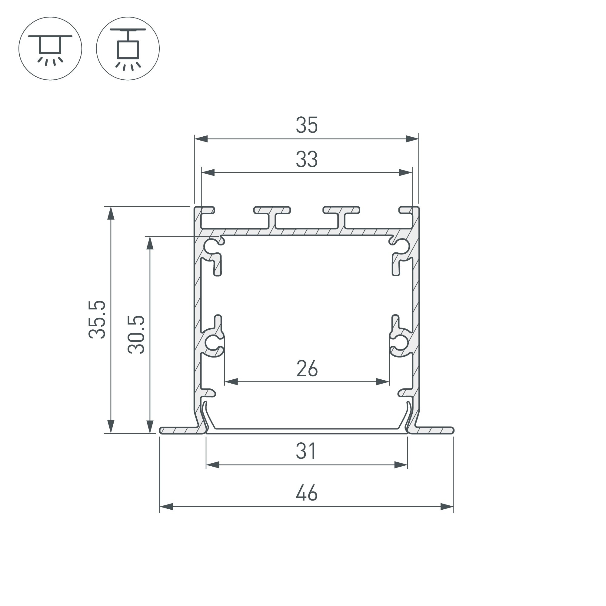 Алюминиевый профиль для светодиодных лент и линеек. Цвет - чёрный RAL9005 (порошковая окраска). Габаритные размеры (L×W×H): 2000x46x35,5 мм, паз для установки 35 мм. Ширина площадки для ленты 26 мм. Экраны, заглушки и другие аксессуары приобретаются отдельно. Цена за 1 метр.