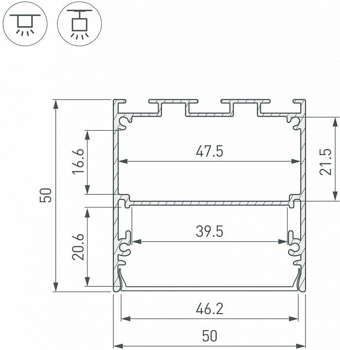 Алюминиевый анодированный профиль для светодиодных лент и линеек. Габаритные размеры (L×W×H): 3000x50x50 мм. Ширина площадки для ленты 39,5 мм. Отсек для БП 39,5х21,5 мм. Экраны, заглушки и другие аксессуары приобретаются отдельно. Цена за 1 метр.