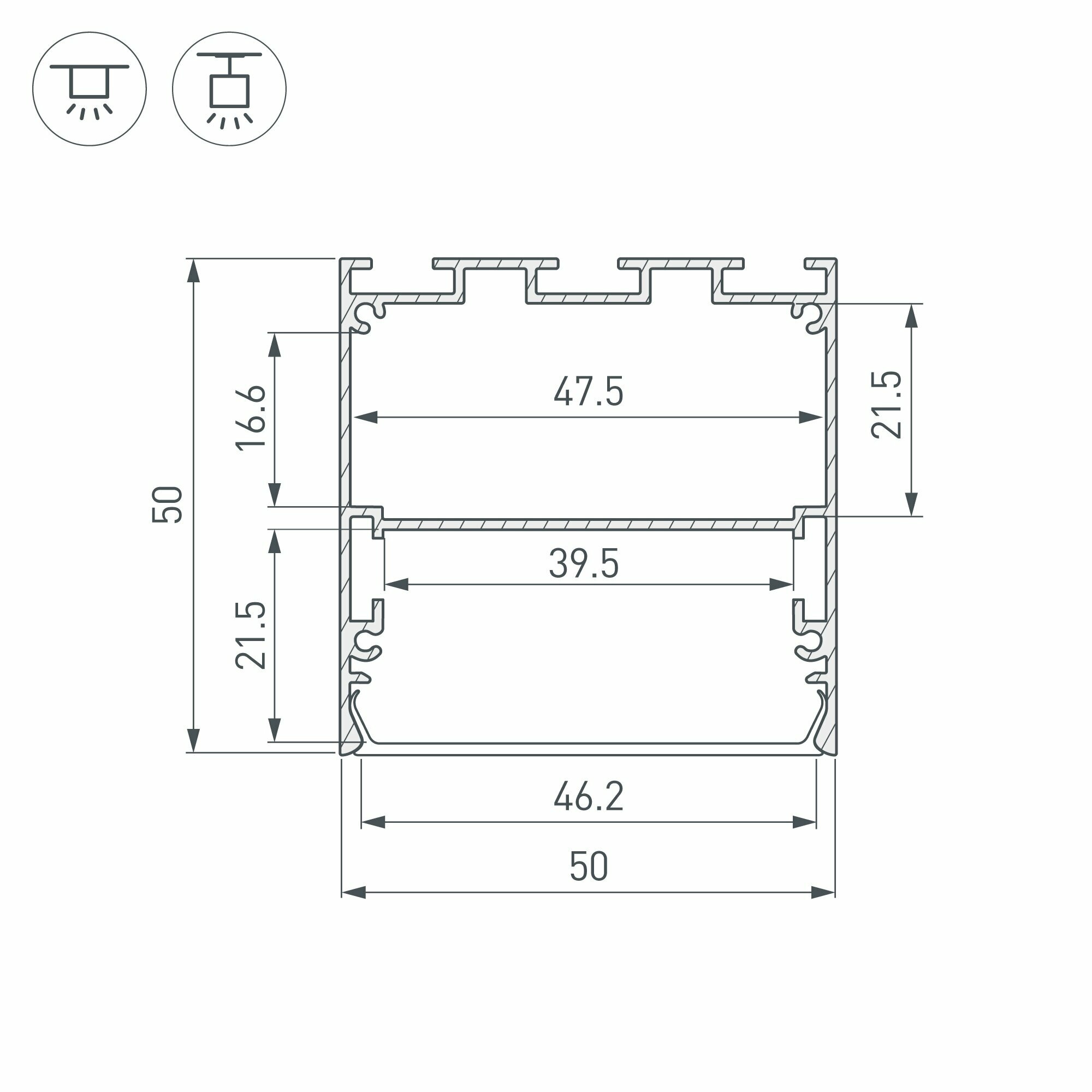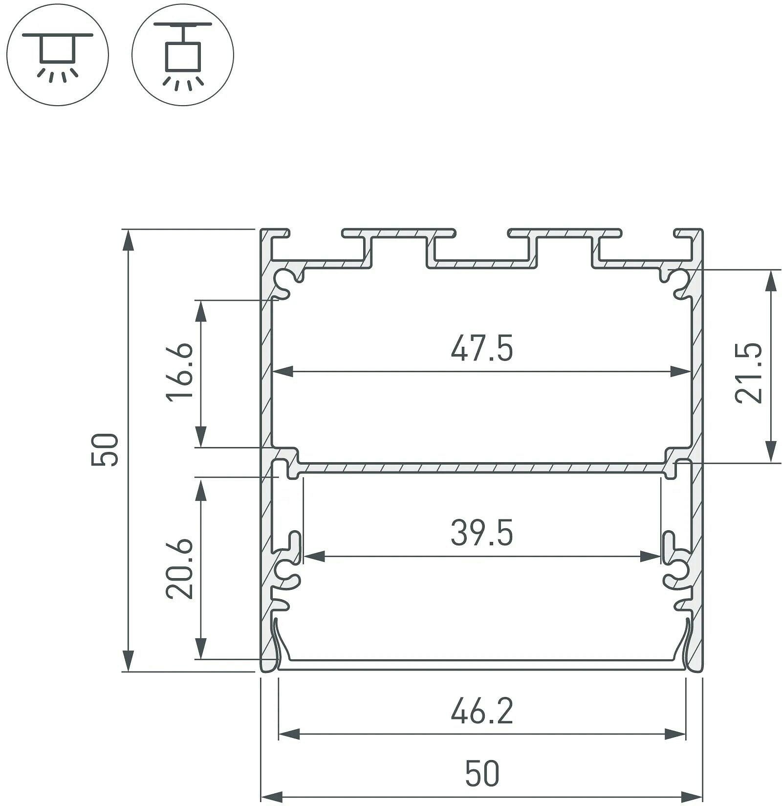 Алюминиевый анодированный профиль для светодиодных лент и линеек. Габаритные размеры (L×W×H): 2000x50x50 мм. Ширина площадки для ленты 39,5 мм. Отсек для БП 39,5х21,5 мм. Экраны, заглушки и другие аксессуары приобретаются отдельно. Цена за 1 метр.