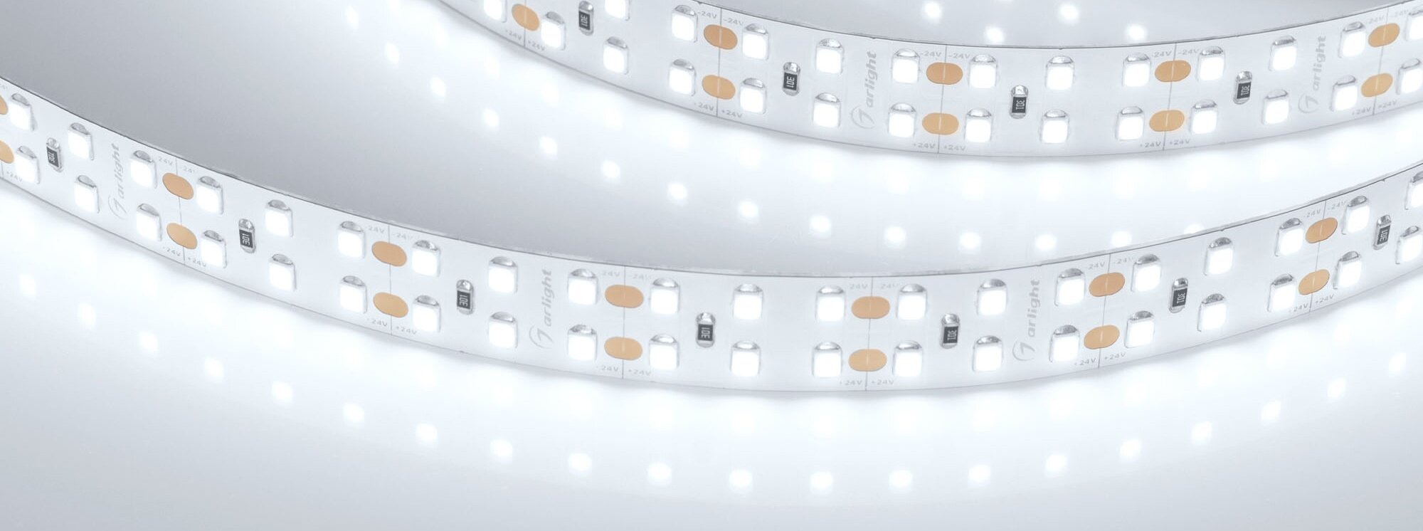 Широкая двухрядная светодиодная лента шириной 15 мм. Светодиоды SMD 2835 (240 шт/м) с холодным белым цветом свечением (6000 К), индекс цветопередачи CRI>90. Мощность 19.2 Вт/м, напряжение питания 24 В. Минимальный отрезок 25 мм (6 светодиодов). Встроенные линии света для основного освещения. Создание накладных и подвесных светильников из алюминиевого профиля.