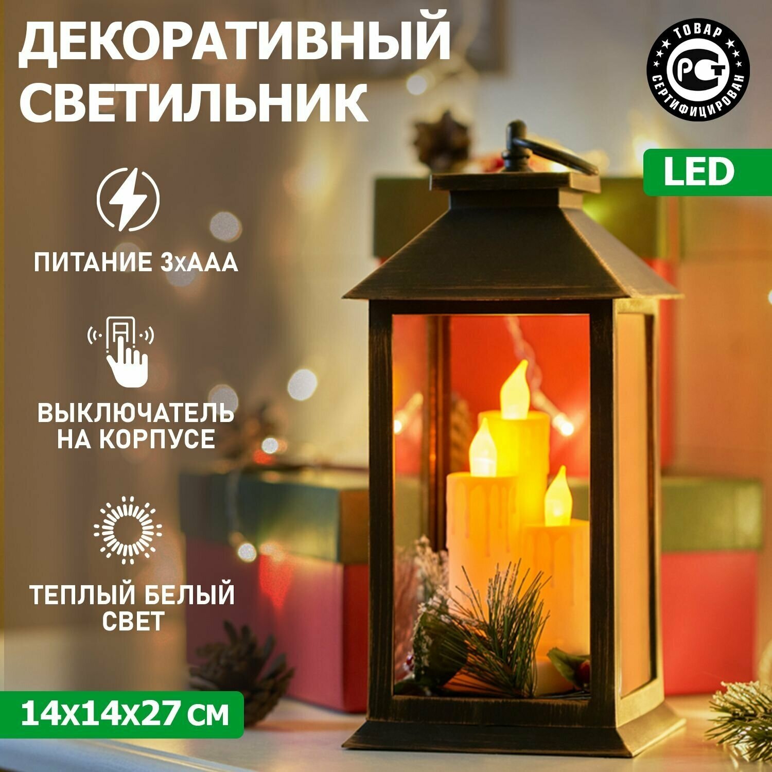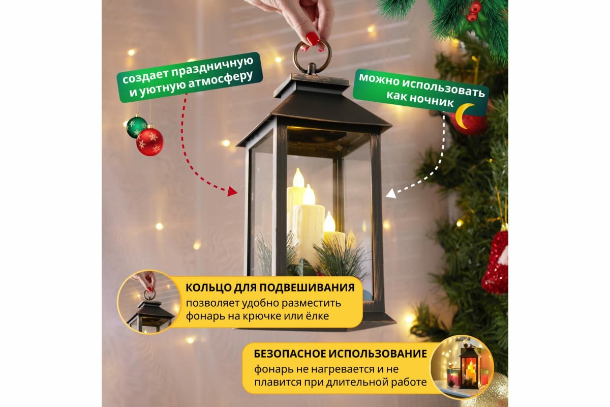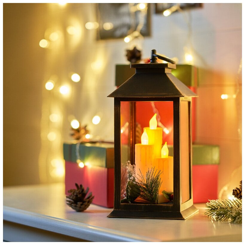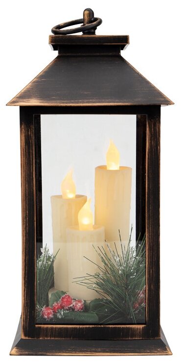 Декоративный фонарь-светильник с 3 свечками внутри имеет размер 14х14х27 см. Корпус изделия выполнен в бронзовом цвете, а стенки изготовлены из прозрачного стекла. Стильное интерьерное украшение поможет создать уют и ощущение тепла. Декоративным фонарем можно украсить как любую часть дома: детскую, гостиную, столовую, так и кафе, фотозону. В фонаре расположены 3 пластиковые свечки, имитирующие восковые, имеющие по 1 безопасному светодиоду, которые не нагреваются и излучают теплое белое свечение похожее на ровное желтое пламя. Ночник можно подвесить за кольцо. Изделие мощностью 0,1 Вт питается от 3 батареек типа ААА (приобретаются отдельно), имеет невысокую степень влагозащиты IP20, используется в сухих отапливаемых помещениях. На корпусе есть кнопка ON/OFF для включения и выключения подсветки. Благодаря встроенным светодиодам изделие обладает долгим сроком службы, низким энергопотреблением и надежностью. Температурный режим работы светодиодной фигурки: от 0 до +40 градусов Цельсия.