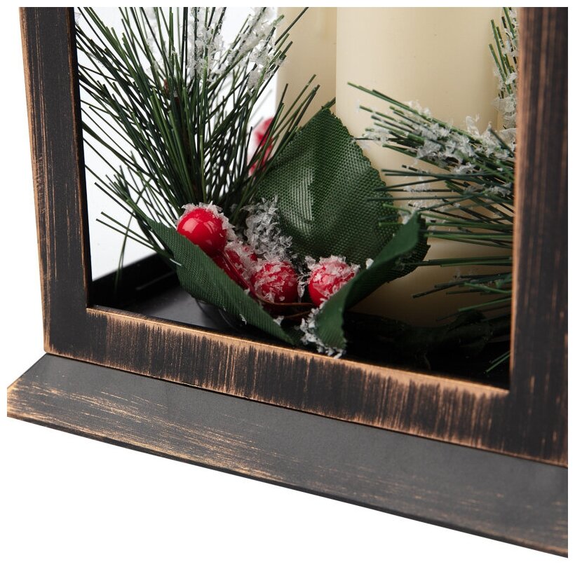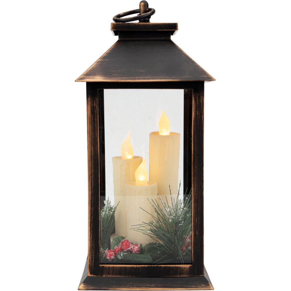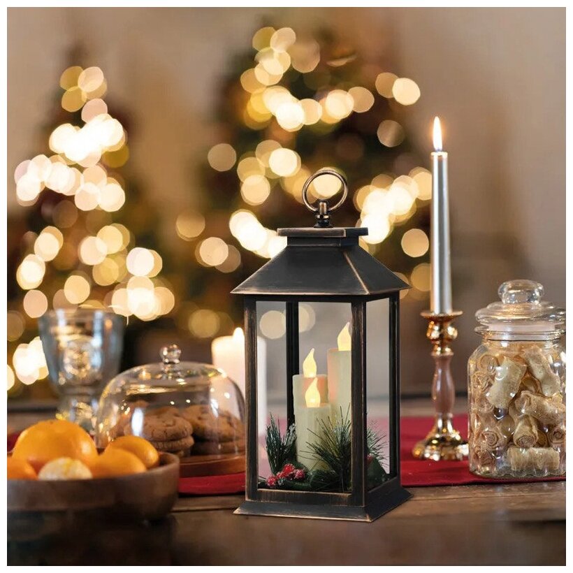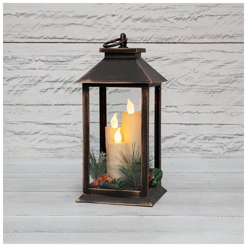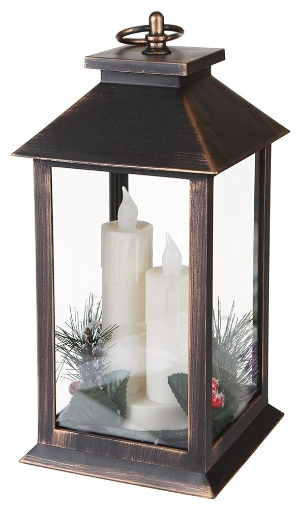 Декоративный фонарь-светильник с 3 свечками внутри имеет размер 14х14х27 см. Корпус изделия выполнен в бронзовом цвете, а стенки изготовлены из прозрачного стекла. Стильное интерьерное украшение поможет создать уют и ощущение тепла. Декоративным фонарем можно украсить как любую часть дома: детскую, гостиную, столовую, так и кафе, фотозону. В фонаре расположены 3 пластиковые свечки, имитирующие восковые, имеющие по 1 безопасному светодиоду, которые не нагреваются и излучают теплое белое свечение похожее на ровное желтое пламя. Ночник можно подвесить за кольцо. Изделие мощностью 0,1 Вт питается от 3 батареек типа ААА (приобретаются отдельно), имеет невысокую степень влагозащиты IP20, используется в сухих отапливаемых помещениях. На корпусе есть кнопка ON/OFF для включения и выключения подсветки. Благодаря встроенным светодиодам изделие обладает долгим сроком службы, низким энергопотреблением и надежностью. Температурный режим работы светодиодной фигурки: от 0 до +40 градусов Цельсия.