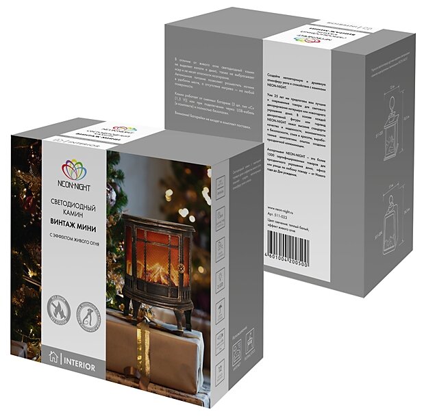 "**Камин светодиодный Neon-Night Винтаж Мини** — это декоративный светиодный светильник, который будет создавать уют долгими зимними вечерами. Динамическое мерцание 3 светодиодов создает реалистичный эффект живого пламени. Подойдет для мягкого вечернего освещения, может использоваться в качестве ночника или рождественского декора. Винтажный фасад камина искусственно состарен.
