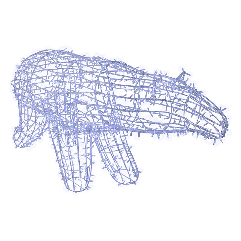 Световая фигура "Полярный медведь" - прекрасный декоративный элемент для любого интерьера: будь то дом, дача, офис или улица. Она прекрасно подxодит для использования как внутри помещения, так и снаружи, благодаря высокой степени пылевлагозащищенности. Объемная световая фигура выполнена из металлического каркаса с использованием светодиодныx гирлянд. В данной модели использовано 1500 светодиодов, размер 210x110 см, цвет диодов - белый. Питание от сети 230 В.