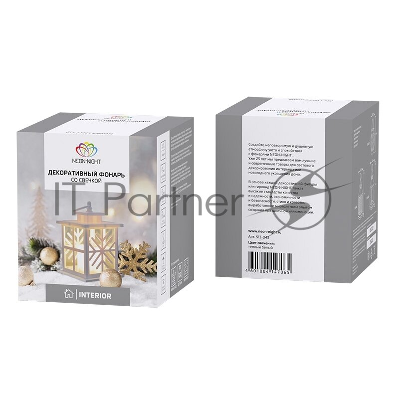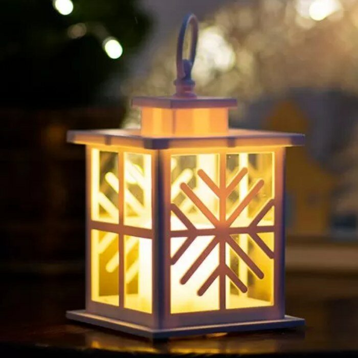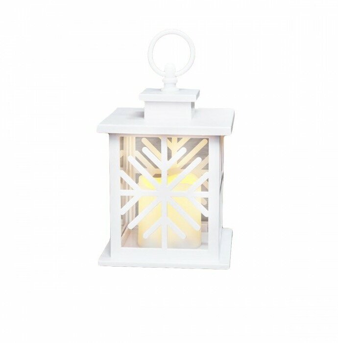 Декоративный фонарь со свечкой выполнен в виде аутентичного светильника, на белом корпусе размещена резная снежинка, а внутри, за стеклом находится пластиковая свеча, которая сияет теплым белым светом, отбрасывая мягкие тени и создавая атмосферу уюта. Экономичный безопасный светодиод получает питание от 3 батареек типа ААА и управляется выключателем на корпусе. Декоративный фонарь гармонично украсит интерьер любого стилевого направления и станет приятным подарком к празднику.