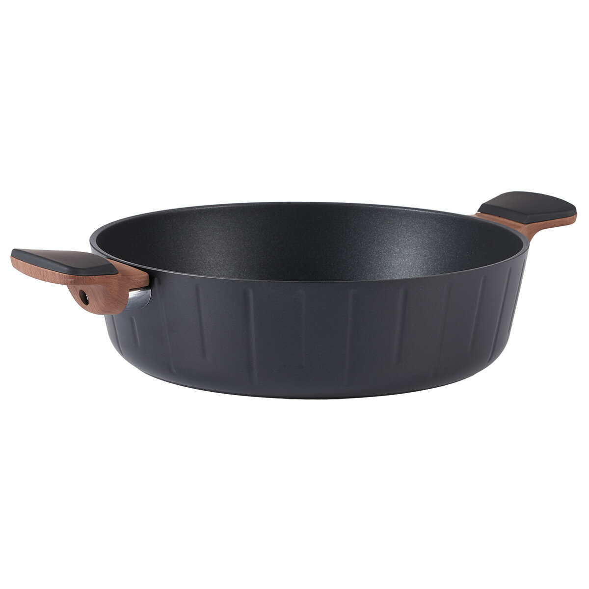Сотейник выполнен в лаконичном дизайне: основание черного цвета, стеклянная крышка с силиконовым ободом и бакелитовой ручкой в коричневом цвете с отделкой под дерево и покрытием Soft Touch (удобно держать и не скользит в руке). Толщина дна: 3,3 мм, толщина стенок: 2,8 мм.