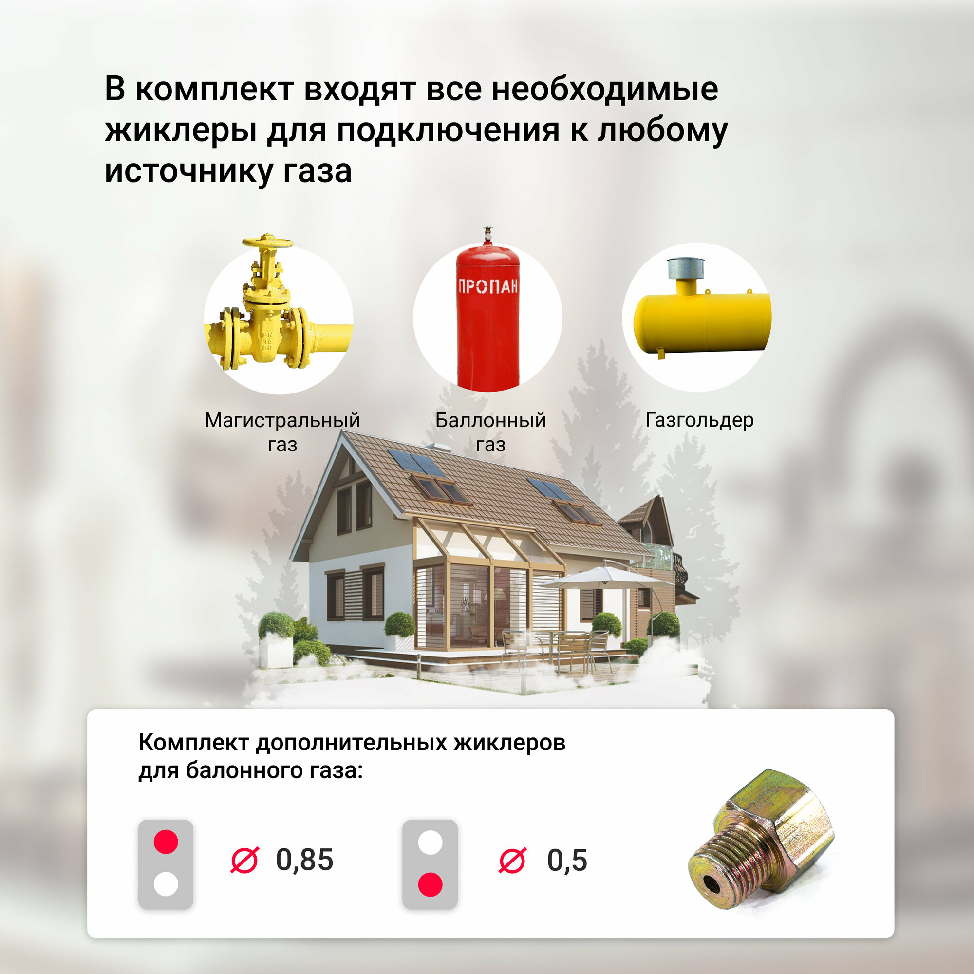 • Комплектация: цельная чугунная решётка, жиклёры для баллонного газа