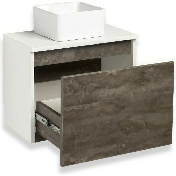 Тумба под раковину в ванную RUNO БАРИ (подвесная) - безупречное сочетание модных тенденций с классическим оформлением ванной комнаты. Тумба под раковину БАРИ оснащена выдвижным ящиком на шариковых направляющих, с системой плавного закрывания. Цвет корпуса классический - белый, при этом цвет фасада в модном цвете – железный камень, идеально впишутся в любой интерьер ванной комнаты. К тумбе для ванной подойдут умывальники на столешницу: «UNO 24» (24х24см) – очень маленькая модель, идеально подходит для ограниченного пространства в небольших помещениях. Строгая квадратная геометрически правильная форма раковины, усиливает идею лаконичности в дизайне, устанавливается на столешницу, накладным методом. «DUE 38» (38х24см) – маленькая модель, идеально подходит для ограниченного пространства в небольших помещениях. Строгая прямоугольная геометрически правильная форма раковины с округлыми углами, усиливает идею лаконичности в дизайне, устанавливается на столешницу, накладным методом.