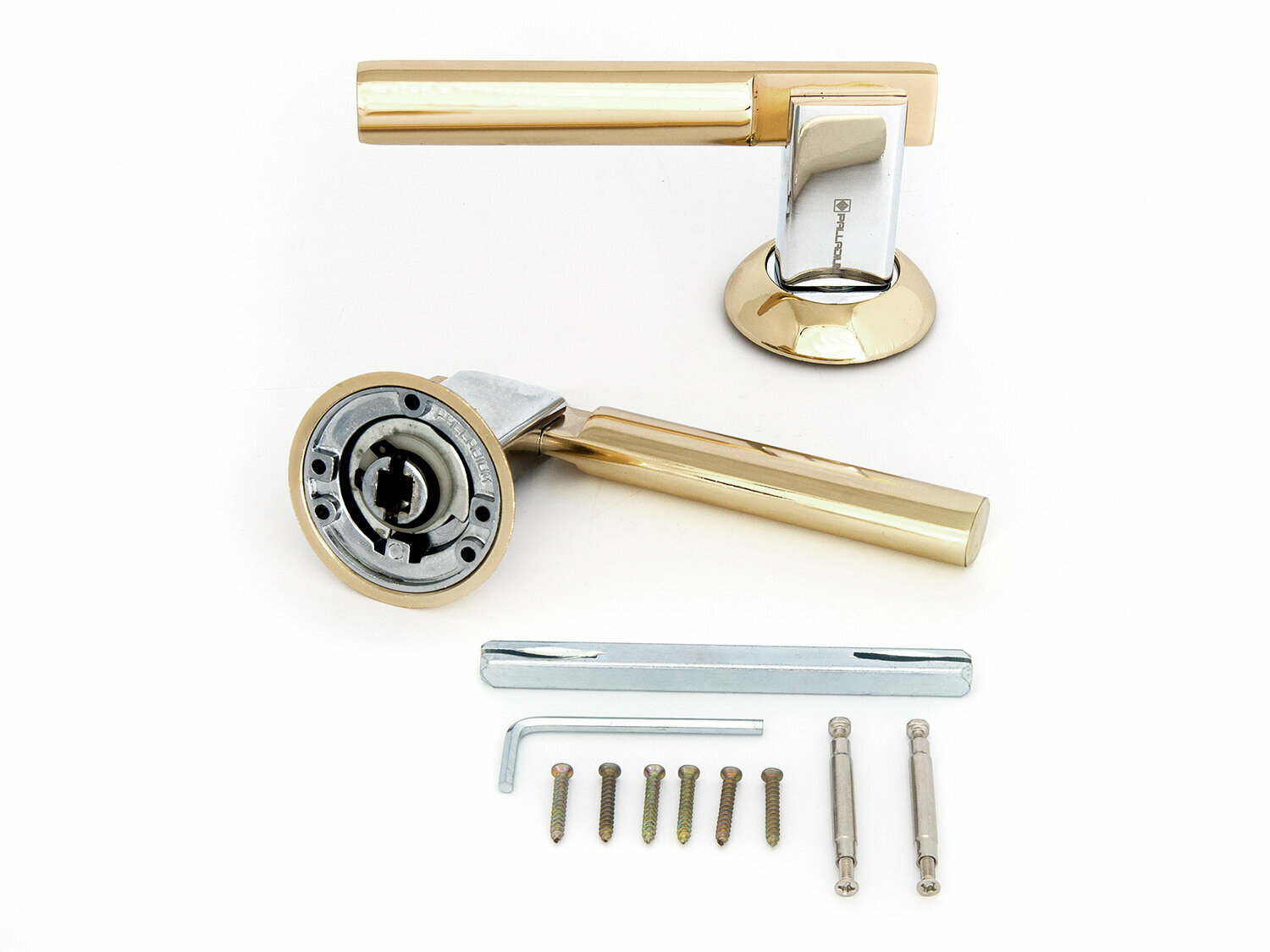 Palladium A Rio – дверная ручка в авангардно-индустриальном стиле. Сочетается с любыми входными и межкомнатными дверьми, кроме строгой классики. Особенно удачно смотрится на царговых деревянных и панельных стальных полотнах. Классическая круглая розетка. Покрытие: шестислойная гальваника. Завершающий слой – двойной лаковый. Стойкость к коррозии: 72 ч в тесте с соляным туманом. Оптимальная (137 мм) длина, мягкий ход пружины. Отсутствие режущих краев (все грани скруглены). Ресурс механизма: не менее 100 000 срабатываний. В комплекте: ручки для дверей (2 шт.), квадрат 8x8 мм, шестигранник, шурупы (6 шт.), стяжные винты (2 шт.). Материал: алюминий Цвет: золото/хром Упаковка: коробка