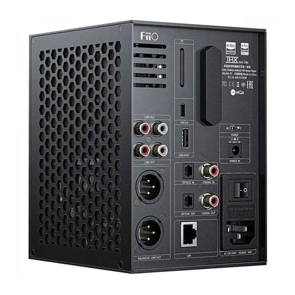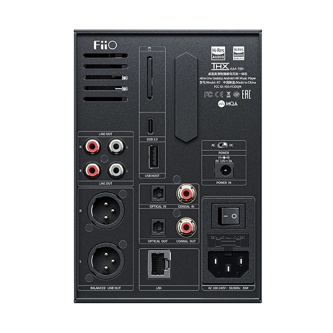 Цифровая часть плеера выполнена на базе процессора Snapdragon 660 и ЦАП ES9068AS. Фирменная программная оболочка обеспечивает очень удобный доступ к многочисленным функциям аппарата. Для воспроизведения контента в форматах Lossless и High resolution можно использовать Ethernet или Wi-Fi-подключения к домашней сети. Два USB-порта работают в режиме Host, в том числе и для подключения ЦАП, внешних устройств или накопителей. В плеере имеется слот для SD-карт объемом до 2 ТБ. Внешние источники сигнала подключаются через оптический и коаксиальный входы. Сигнал на усилитель можно снимать с небалансных или балансных выходов, а для внешнего ЦАП есть оптический и коаксиальный выходы. Кроме того, FiiO R7 оснащен высококлассным усилителем для наушников на базе двух микросхем THX AAA 788. Предусмотрены выходы для небалансных и балансных моделей. С помощью переключателя на передней панели сигнал перенаправляется на наушники или внешнюю систему.