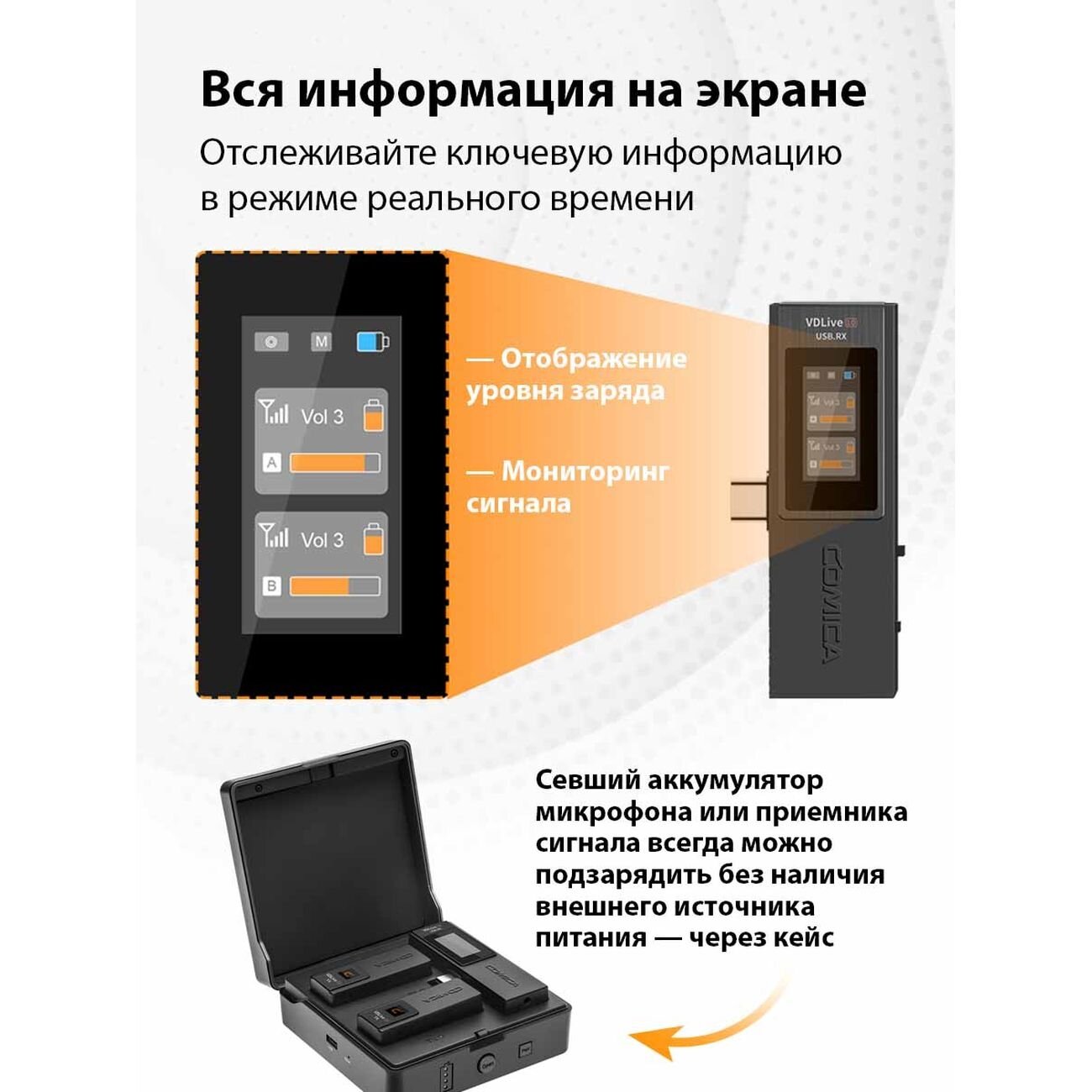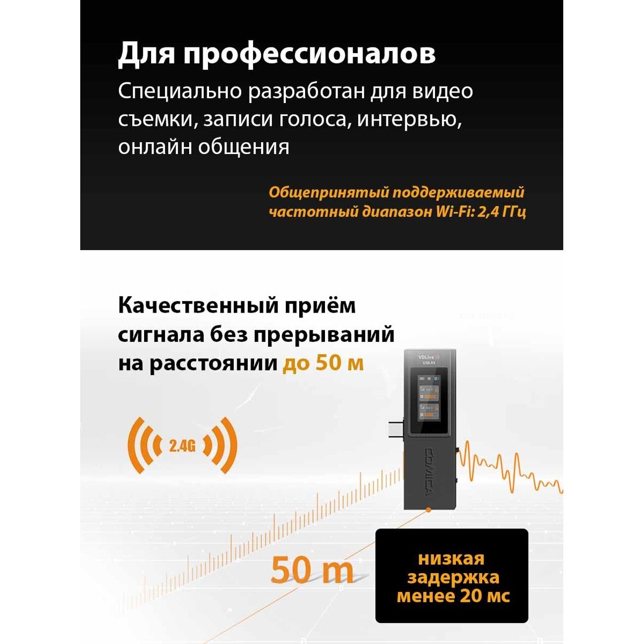 Comica VDLive10 универсальная беспроводная система работающая в диапазоне 2.4 ГГЦ. Система получила поддержку передачи аудио в реальном времени со смартфонов, камер, компьютеров и других устройств.