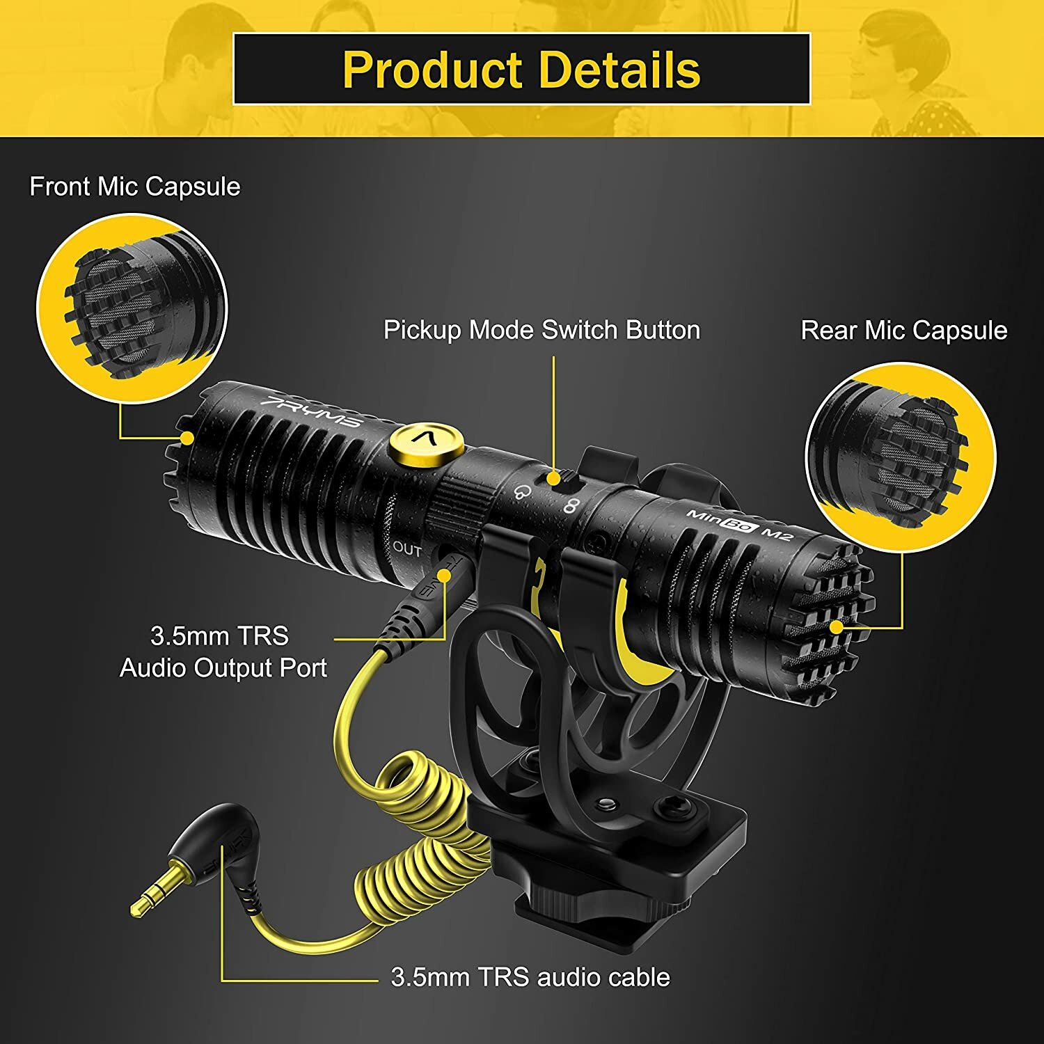 Двухсторонний мини-микрофон 7RYMS для цифровой зеркальной камеры/смартфона видеозаписи воспроизведения (3,5 мм TRS). Основные характеристики: Передняя и задняя двухсторонняя микрофонная направленная конструкция Профессиональная Кардиоидная конденсаторная капсула Без привода питания, удобный для использования Специальное ударное крепление, отличная амортизация Полностью из металла, супер экранировани Частота 60 Гц - 20 кГц. Сигнал/шум >75 дБ. Максимальный уровень звукового давления >105 дБ. Чувствительность -33 дБ ± 2 дБ. Рабочее напряжение 1 В - 10 В постоянного тока. Выходной интерфейс 3,5 мм. Размер 9,9 х 2,2 см, вес 45 г.