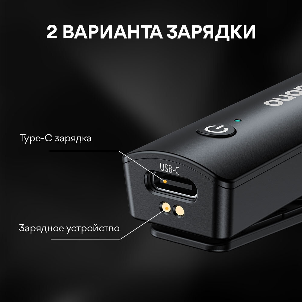 Радиосистема для блогеров, 2 передатчика. Рабочий диапазон 2,4 ГГц. Состоит из приемника, который подключается к мобильному устройству с разъемом Type-C, и миниатюрного передатчика с прищепкой для крепления к одежде. Радиосистема работает от встроенного аккумулятора (350mAh/3.7V), подзаряжаемого от USB-C (DC 5V, Max) или в зарядном кейсе. Передатчик оснащен встроенным всенаправленным микрофоном (80 -16000 Гц, Max SPL 100 дБ), кнопкой Mute, входом 3.5 мм TRS для петличного микрофона. У приемника есть выход 3.5 мм TRS для наушников. Рабочий диапазон до 100 метров. В комплекте: провод для зарядки USB-А/USB-C и ветрозащита.