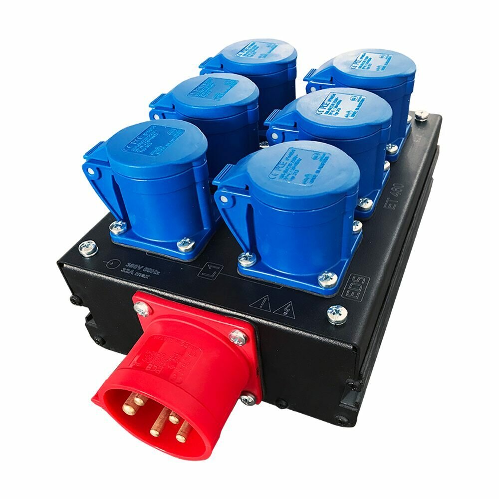 Осуществляет коммутацию от вилки CEE 32A 5-pol. до встроенных розеток PCE CEE16A 3-pol. по две на каждую фазу, а также сквозная коммутация до выходной розетки CEE 32A 5-pol.