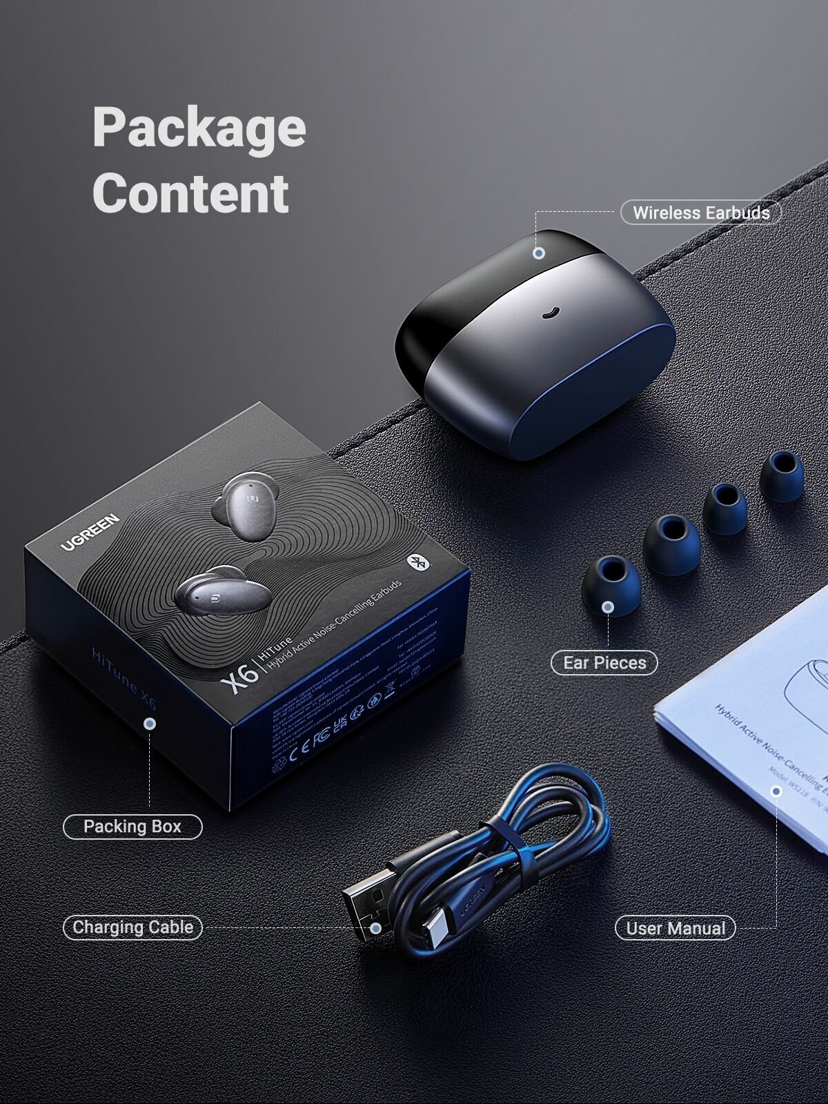 Название Беспроводные наушники UGreen HiTune X6 ANC. Категория Наушники и Bluetooth-гарнитуры. конструкциявнутриканальные, тип устройствабеспроводные TWS-наушники, Система активного шумоподавления (ANC), конструктивные особенностимикрофон, тип зарядки кейсаUSB Type-C, поддерживаемые кодекиAAC, SBC. Тип устройства беспроводные TWS-наушники. Конструкция внутриканальные. Система активного шумоподавления (ANC) есть. Минимальная воспроизводимая частота 20 Гц. Максимальная воспроизводимая частота 20000 Гц. Тип крепления без крепления. Диаметр мембраны 10 мм. Класс защиты (IP) IPX5. Количество микрофонов 6. Конструктивные особенности микрофон. Тип беспроводного соединения Bluetooth. Версия Bluetooth 5.1. Поддерживаемые кодеки AAC, SBC. Время зарядки 1.5 ч. Время работы от аккумулятора в кейсе 26 ч. Тип зарядки кейса USB Type-C. Время зарядки кейса 2 ч. Быстрая зарядка 10 минут зарядки хватает на 60 минут работ.