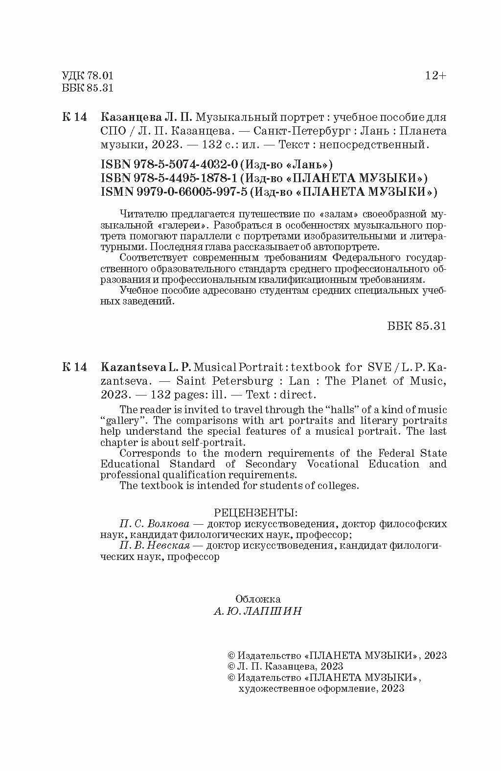 Музыкальный портрет. Учебное пособие для СПО (Казанцева Людмила Павловна); Планета Музыки, 2023