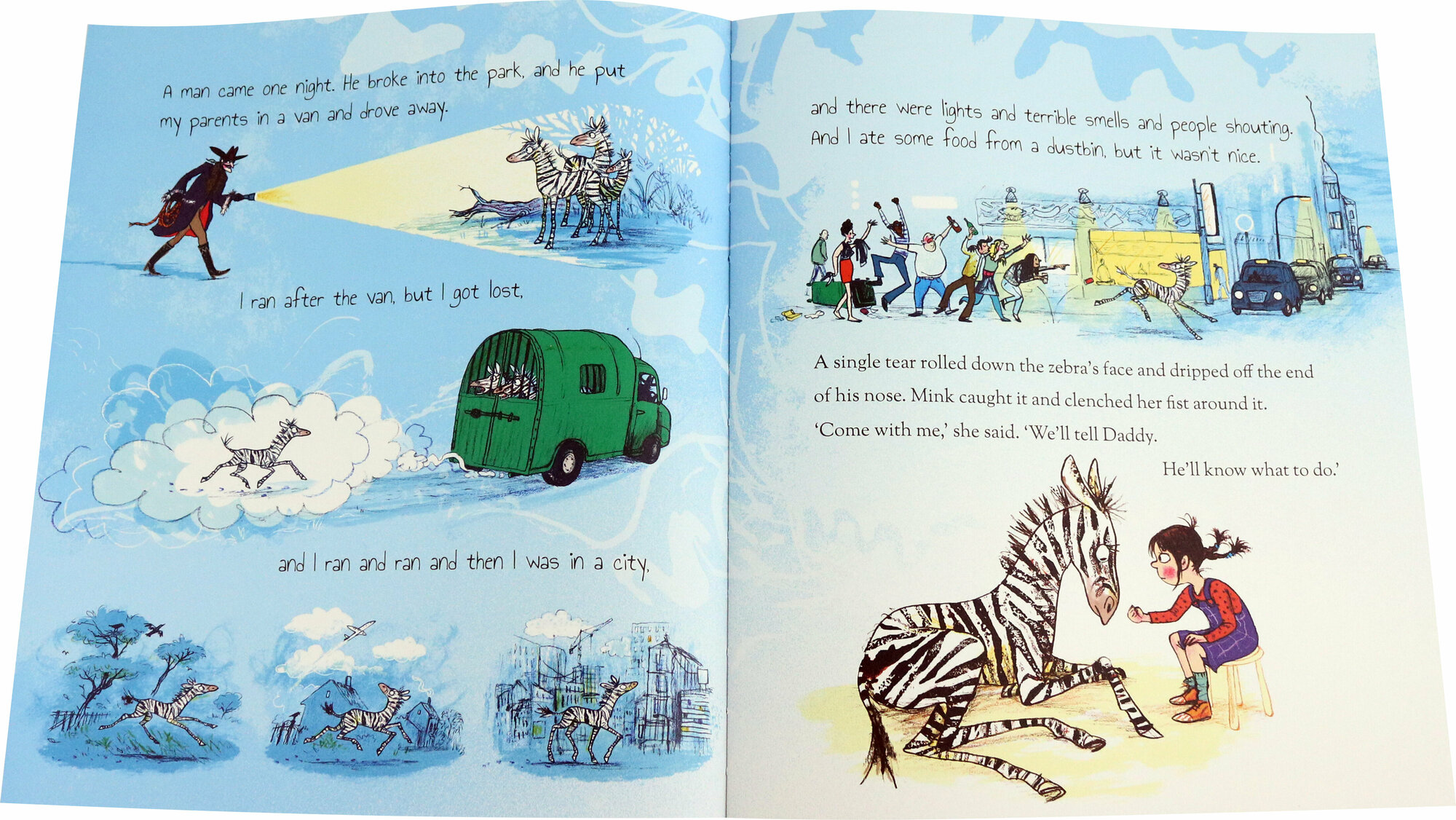 Mink doesn't believe in rules. She loves running wild and free. So, when a zebra appears in the square where she lives and she finds out that his parents have been captured by the evil Mr Spit, she knows that it's up to her to help.