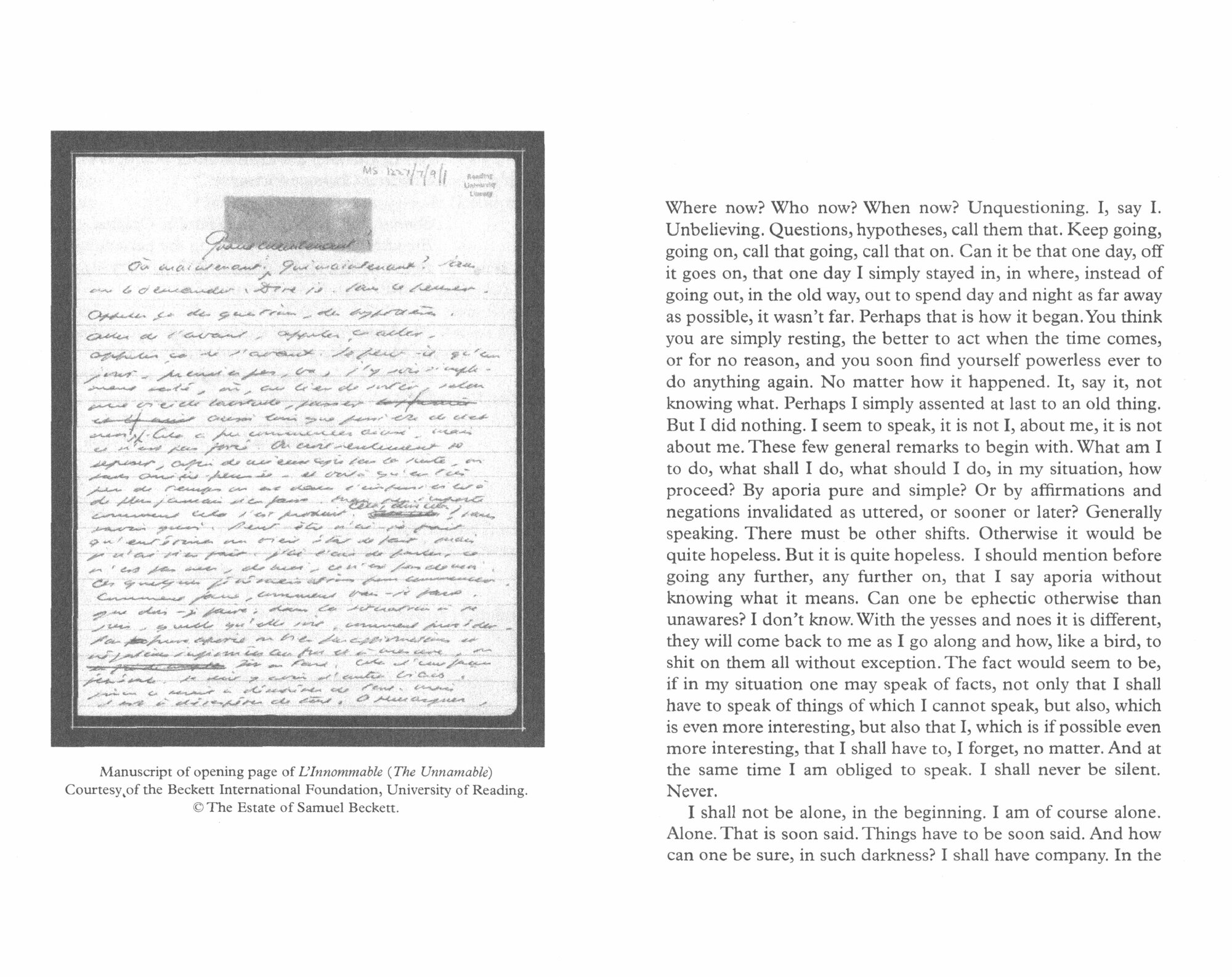 …perhaps the words have carried me to the threshold of my story, before the door that opens on my story, that would surprise me, if it opens, it will be I, will be the silence, where I am, I don’t know, I’ll never know, in the silence you don’t know, you must go on, I can’t go on, I’ll go on.