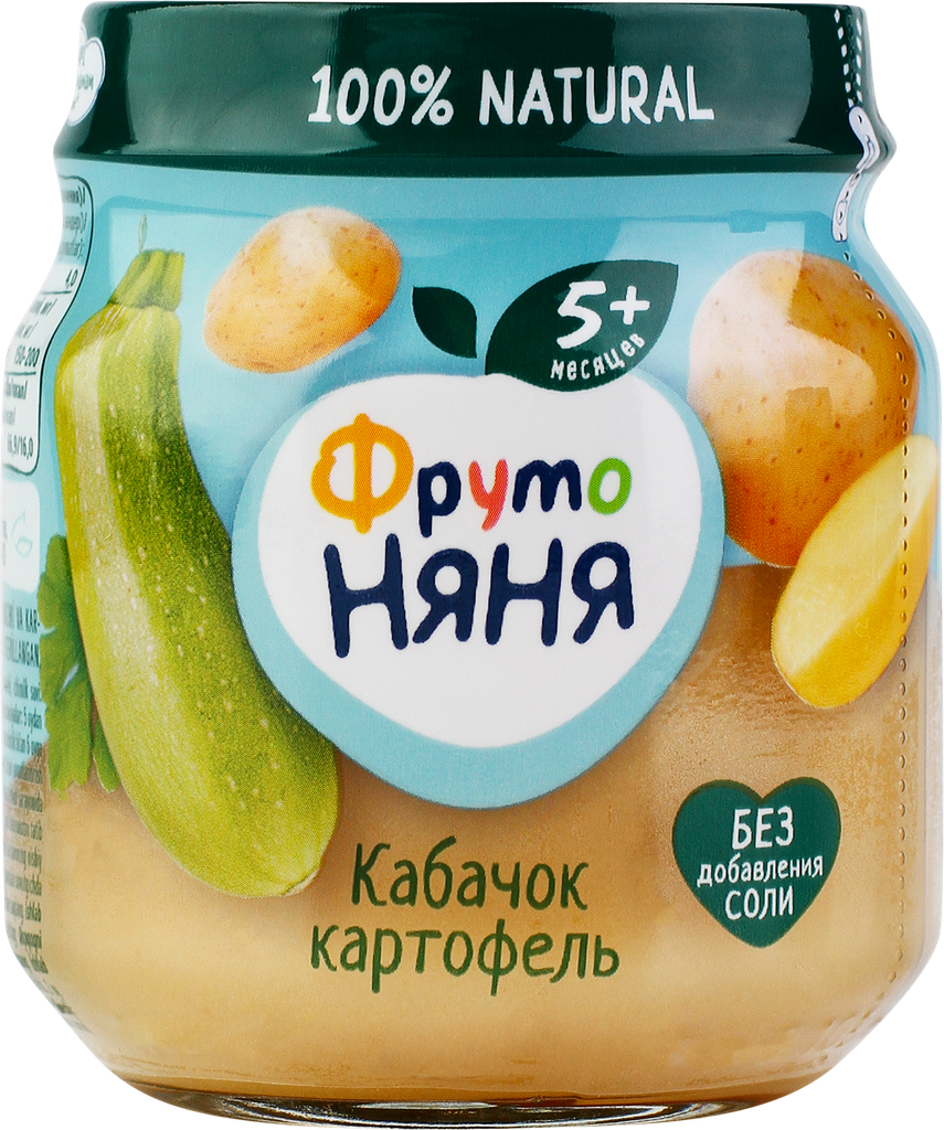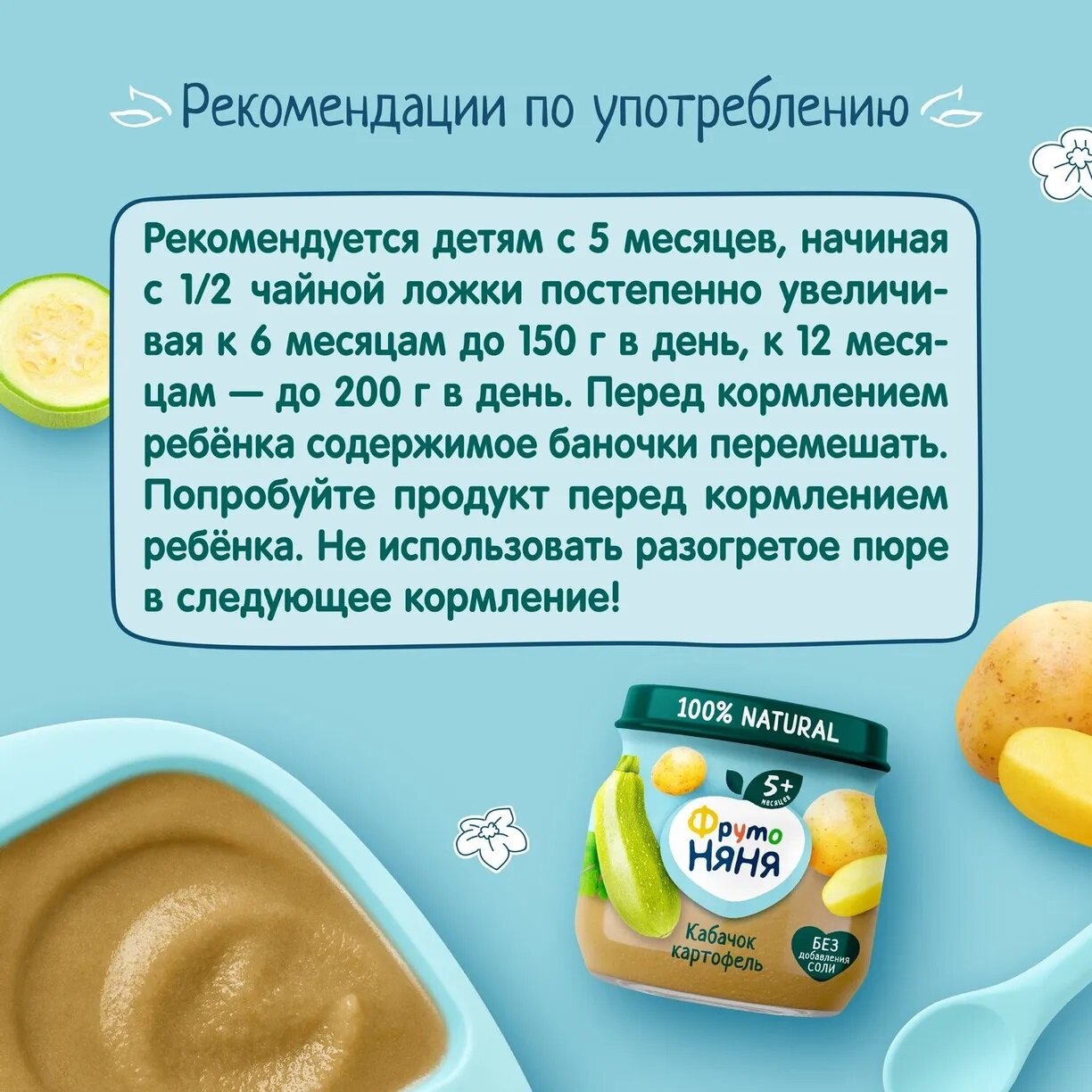 Овощное пюре ФрутоНяня Кабачок и картофель — подходит для продолжения прикорма ребенка с пяти месяцев. Приготовлено из натуральных ингредиентов, поэтому сохраняет максимальное количество полезных веществ. Насыщает энергией, поддерживает иммунитет и здоровый рост. Сбалансированный естественный вкус без консервантов, красителей, крахмала, соли и ГМО. Густая однородная текстура — легко проглатывается и усваивается. Готово к употреблению, при необходимости можно разогреть. В герметичной упаковке с увеличенным объемом 110 г — удобно брать с собой на прогулки, в гости или путешествия.