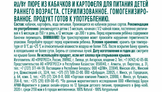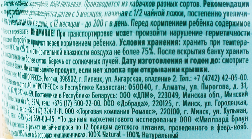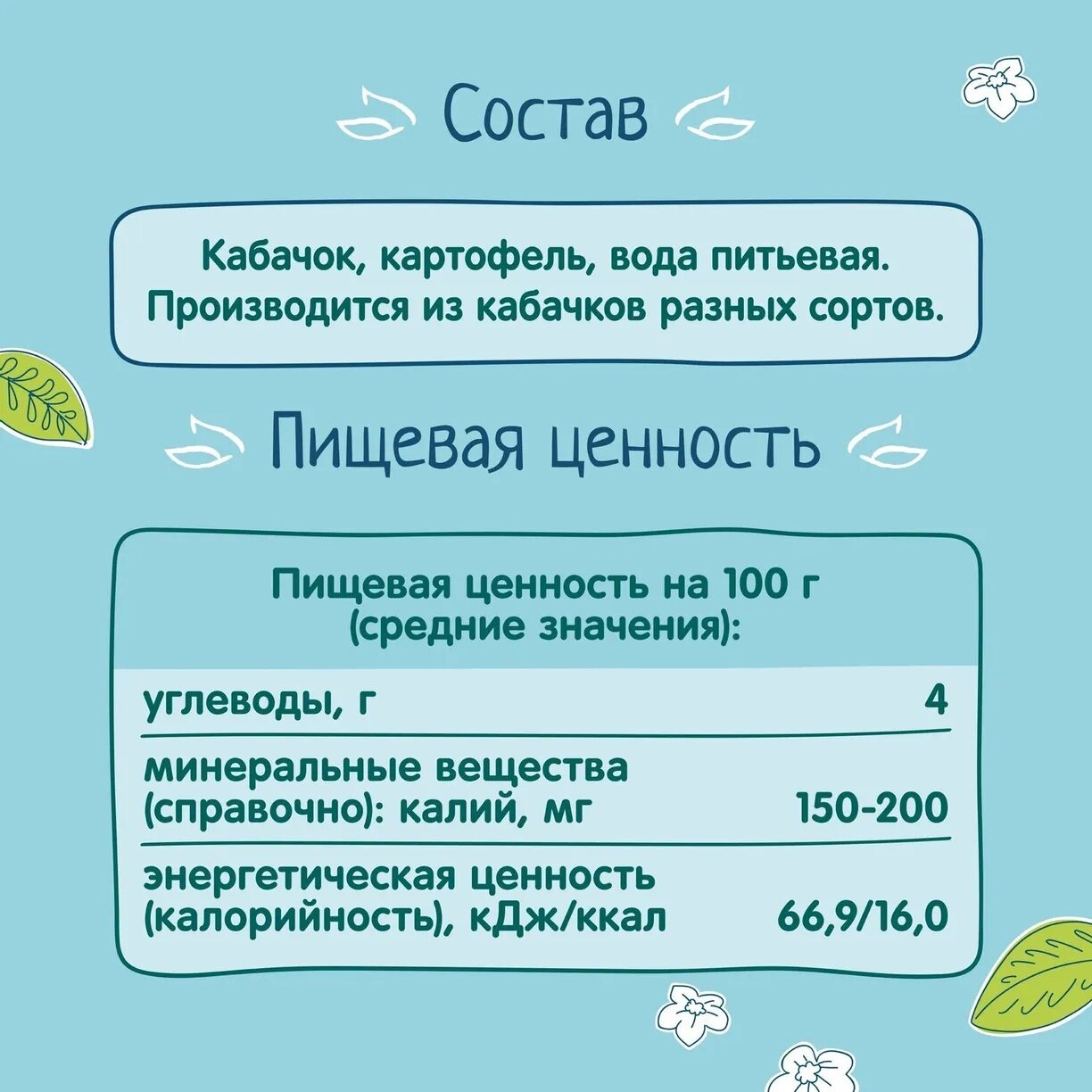 | Состав | Кабачок, картофель, вода питьевая. Производится из кабачков различных сортов. |