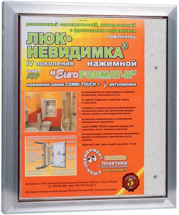 Ревизионный сантехнический Люк невидимка под плитку ЕвроФОРМАТ-Р АТР предназначен для скрытого доступа к инженерным и сантехническим коммуникациям. Наличие магнитно - нажимного замка позволяет открывать люк как нажатием, так и с помощью вакуумной присоски. Отличается от подобных изделий продуманностью каждой детали. Для успешного функционирования этот люк не требует газовых амортизаторов.