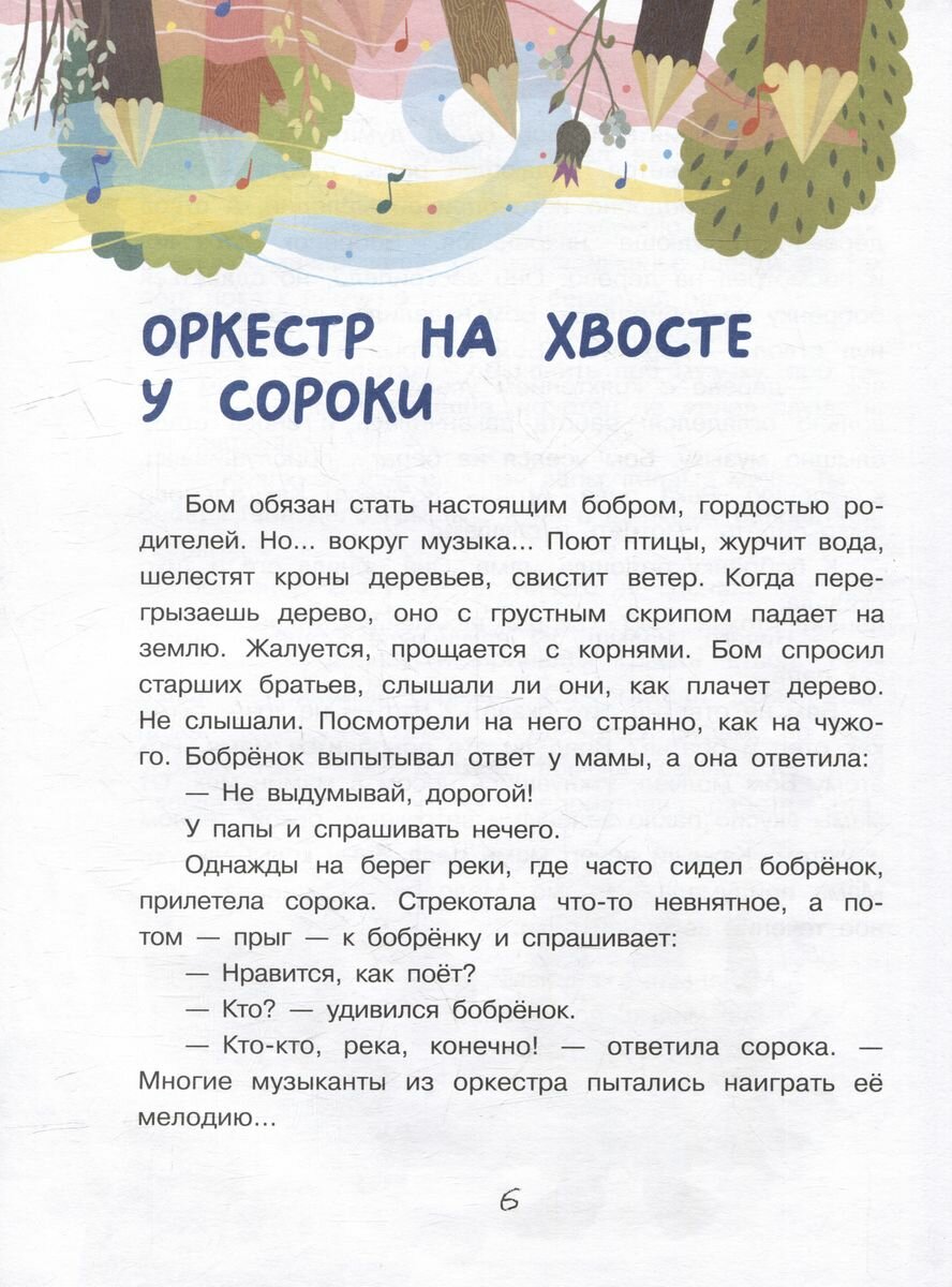 Однажды Бом встретится с сорокой, которая раскрыла ему секрет Дальнего леса. И вскоре втайне от всех Бом стал посещать Ближний лес и получать уроки музыки от филина Фуба Уховича. «Музыкант без инструмента, как река без воды», – заявил учитель и подарил бобрёнку скрипку. И уже через месяц Бом играл простые мелодии и пытался сочинять сам.