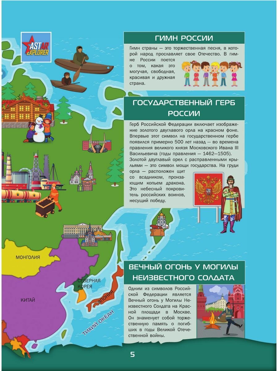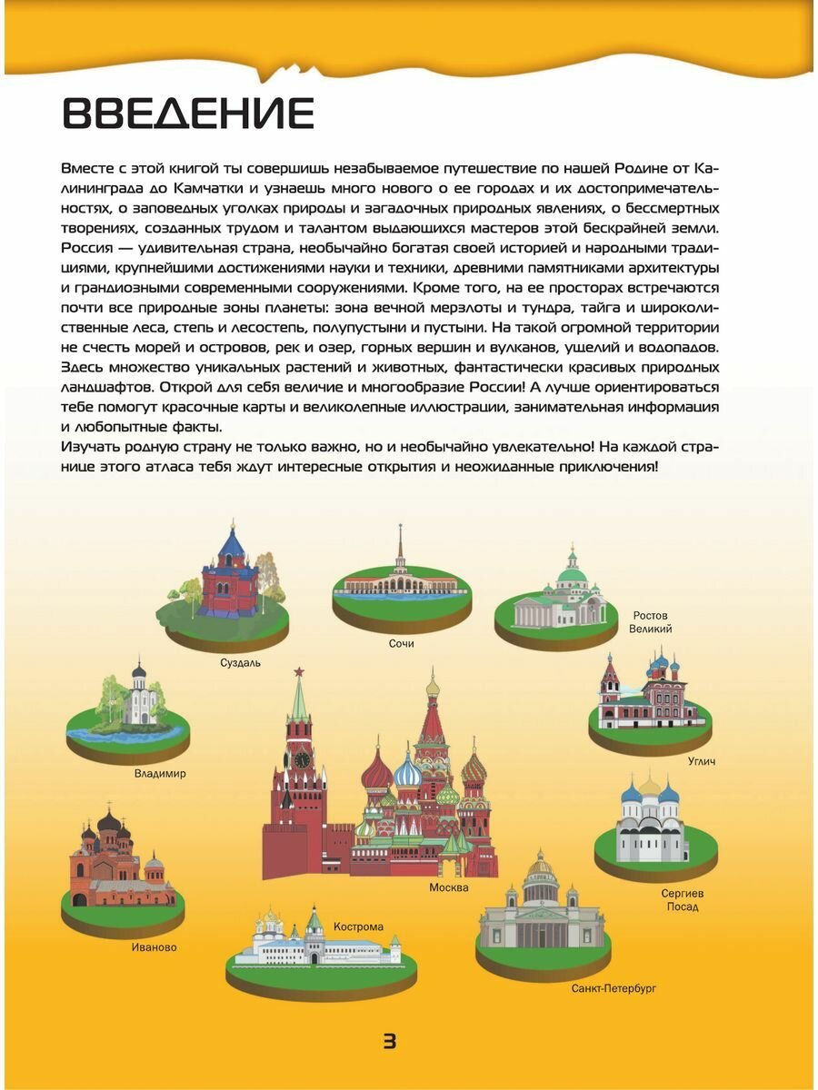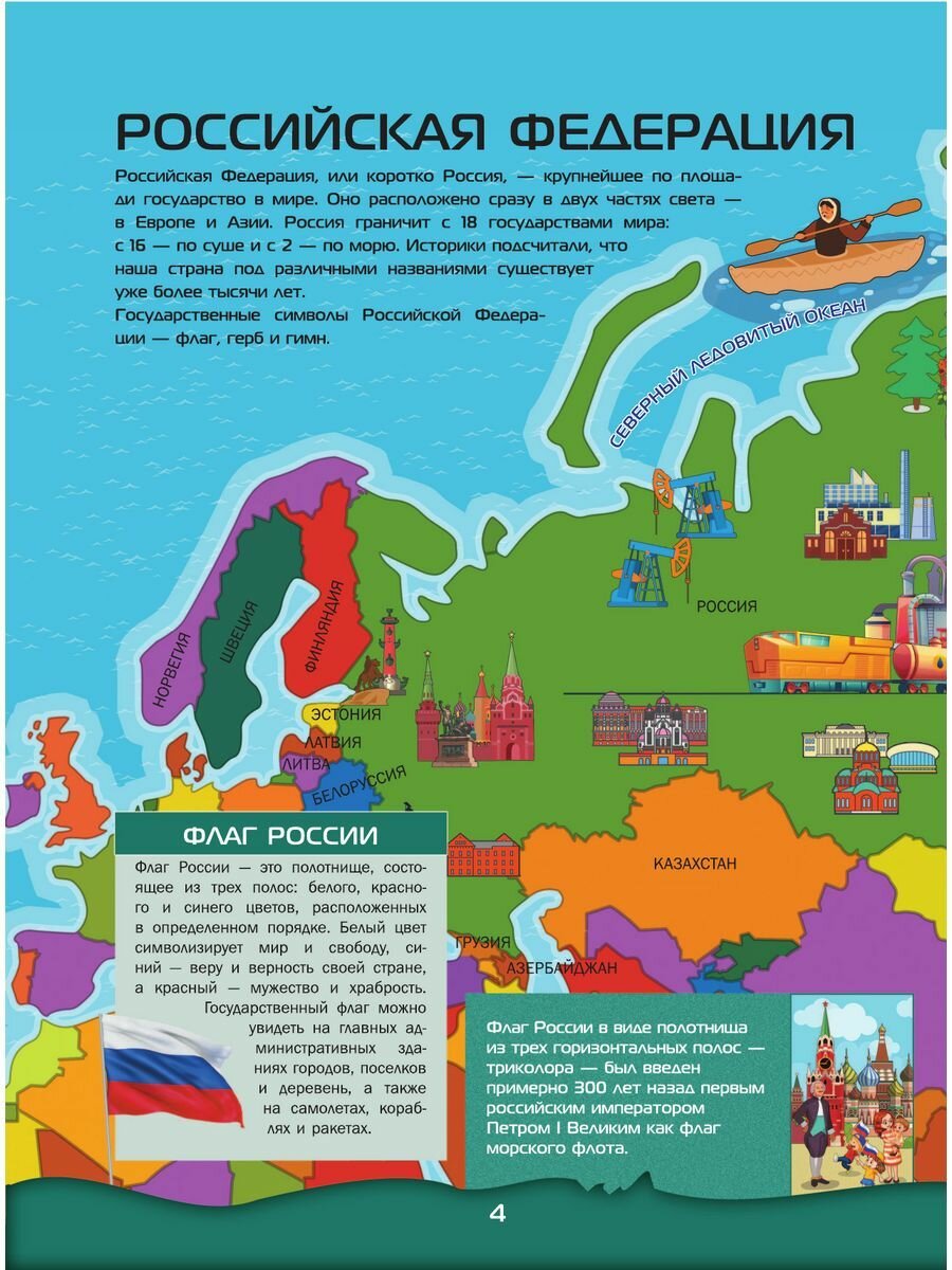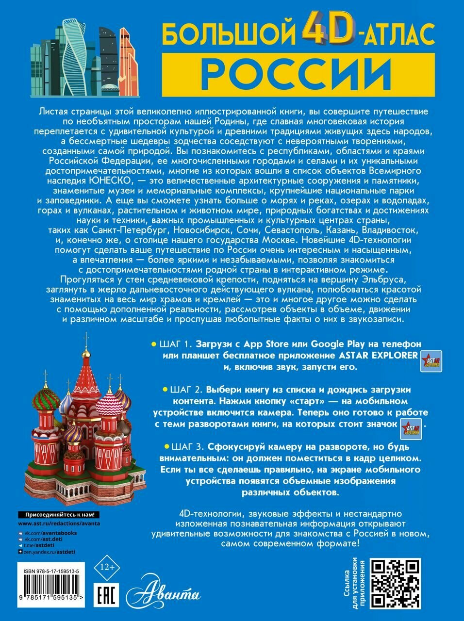 Большой 4D-атлас станет вашим гидом в увлекательном путешествии по России. Он расскажет о республиках, краях и областях Российской Федерации, ее крупнейших мегаполисах, таких как столица нашей Родины Москва, главный культурный центр Санкт-Петербург, самый большой город Сибири Новосибирск, краса и гордость Татарстана Казань и многих других. Здесь же содержится интересная информация о городах поменьше, входящих в список «Золотое кольцо России», а также древних селениях, ставших музеями под открытым небом. Вы сможете лучше изучить географию нашей страны, ее растительный и животный мир, природные богатства, достижения науки и техники. Важные сведения и любопытные факты в этой книге приведены в сопровождении огромного количества зрелищных иллюстраций, позволяющих позна- комиться с величественными православными храмами и мусульманскими мечетями, великолепными дворцами, неприступными средневековыми башнями и боевыми крепостями, самыми протяженными мостами и грандиозными дамбами, загадочными дольменами и мистическими скальными образованиями, таинственными пещерами и огнедышащими вулканами, высочайшими горными пиками и красивейшими водопадами, удивительными обитателями живой природы и впечатляющими образцами отечественной техники. Но главное - использование новейших 4D-технологий позволит рассмотреть многочисленные природные, культурные и исторические достопримечательности нашей страны со всех сторон, в цвете и объеме, а познавательные сообщения о них прослушать в звукозаписи. Для этого вам нужно будет лишь скачать бесплатное приложение ASTAR EXPLORER и действовать согласно несложной инструкции.