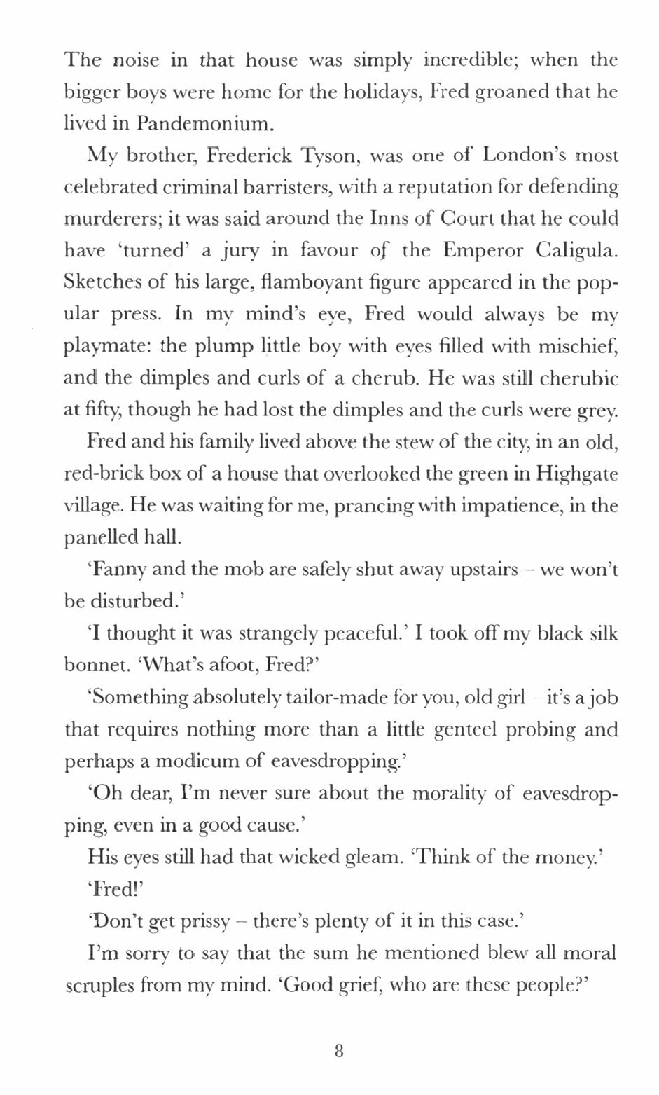Mrs Laetitia Rodd is the impoverished widow of an Archdeacon, living modestly in Hampstead with her landlady Mrs Bentley. She is also a private detective of the utmost discretion. In winter 1850, her brother Frederick, a criminal barrister, introduces her to Sir James Calderstone, a wealthy and powerful industrialist who asks Mrs Rodd to investigate the background of an 'unsuitable' woman his son intends to marry – a match he is determined to prevent.