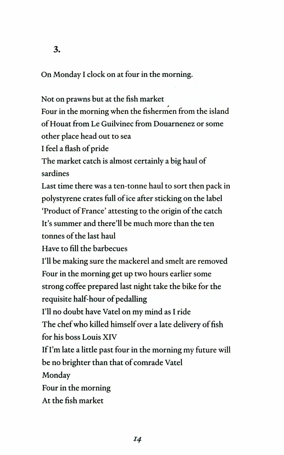 Shelling prawns, he dreams of Alexandre Dumas. Pushing cattle carcasses, he recalls Apollinaire. And, in the grace of the blank spaces created by his insistent return to a new line of text – mirroring his continued return to the production line – we discover the woman he loves, the happiness of a Sunday, Pok Pok the dog, the smell of the sea.