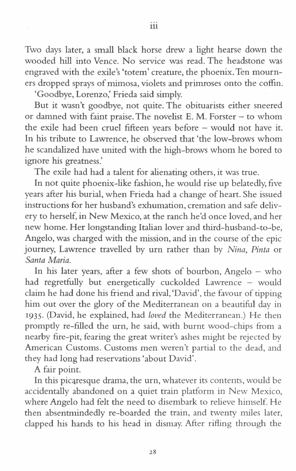 D. H. Lawrence is dying. Exiled in the Mediterranean, he dreams of the past. There are the years early in his marriage during the war, where his desperation drives him to commit a terrible betrayal. And there is a woman in an Italian courtyard, her chestnut hair red with summer.