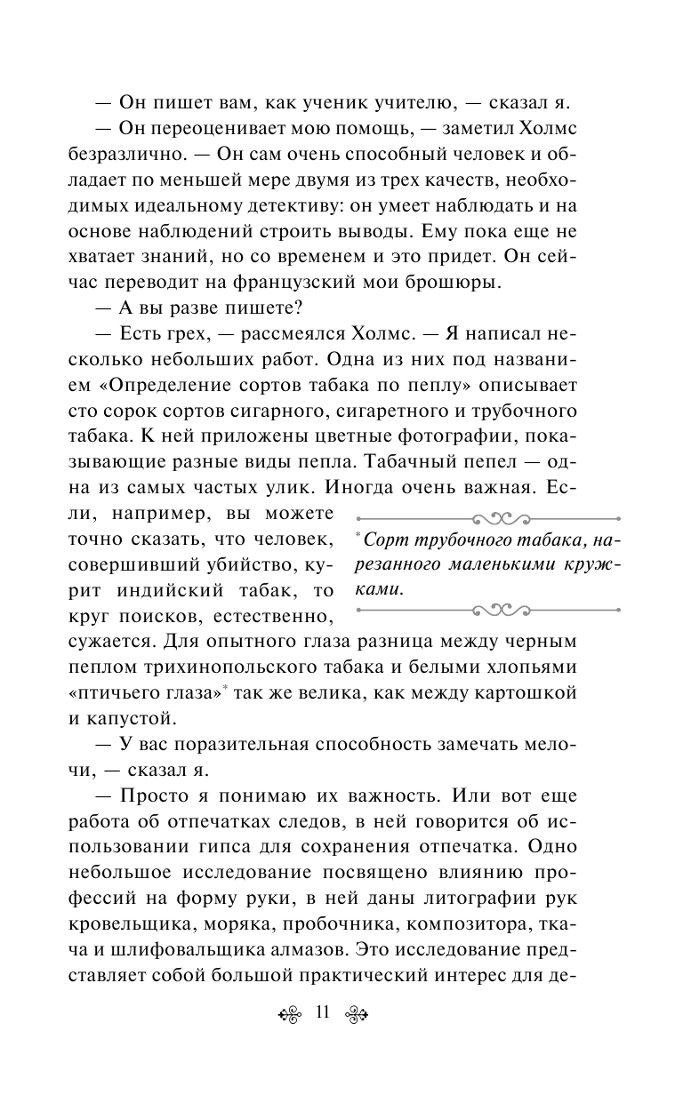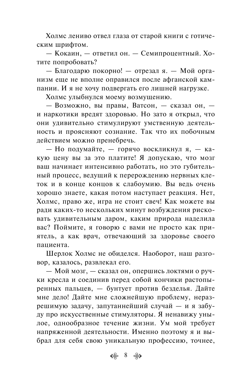 Благородный и бесстрашный борец со Злом, обладатель острого ума и необыкновенной наблюдательности, с помощью своего дедуктивного метода сыщик решает самые запутанные головоломки, зачастую спасая этим человеческие жизни. Он гениально перевоплощается, обладает актерским даром и умеет поставить эффектную точку в конце каждого блестяще проведенного им расследования. Неутомимый Шерлок Холмс и его легко увлекающийся друг доктор Ватсон дороги сердцу читателей всего мира.
