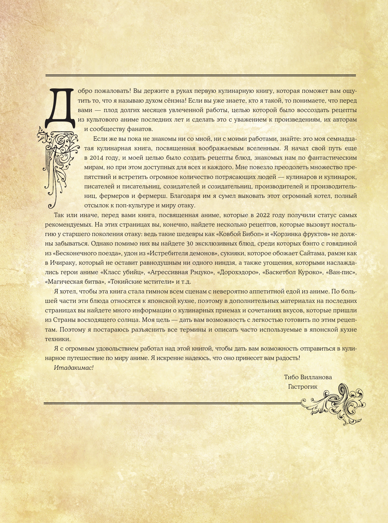 Хотите попробовать ту же еду, что и герои ваших любимых аниме? Это просто! В книге вас ждут 40 рецептов из самых разных тайтлов: и новых, быстро завоевавших всемирную популярность, и старых, ставших уже классическими! Тот самый рамэн для Наруто, гюдон для Ренгоку, безумные бургеры из "Боруто" и еще множество блюд, которые так и хочется попробовать, включая очередную серию любимого аниме!
