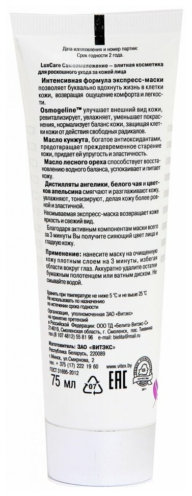 Маска для лица Витэкс Экспресс-маска для лица несмываемая 3 минутная 75 мл позволяет буквально вдохнуть жизнь в клетки кожи, возвращая ощущение комфорта и легкости, придает коже яркость и свежий вид.