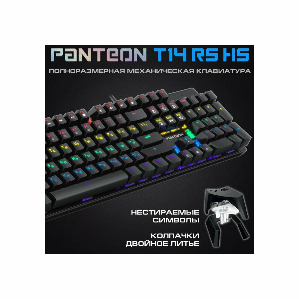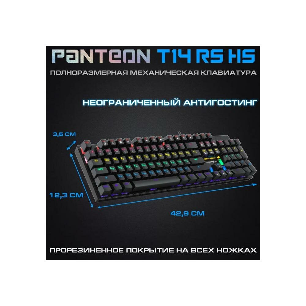 Механические линейные переключатели OUTEMU RED SWITCHES Клавиши PANTEON® T14 RS HS работают на красных свитчах OUTEMU Red Switches, которые отличаются высоким ресурсом наработки на отказ, минимальным расстоянием между точкой срабатывания и точкой сброса, а также линейным ходом без выраженного клика. Усилие на срабатывание 40 г обеспечивает легкость нажатия, мгновенную реакцию и отсутствие усталости даже при длительной работе. Hot Swap - опция, которая позволяет быстро и без проблем заменить вышедший из строя свитч или установить свитч другого цвета. Подсветка RAINBOW LIGHT Сочетание клавиш FN+Ins/Hm/Pu/Del/Pd позволяет переключаться между 20 предустановленными вариантами свечения (по 4 на каждой клавише). Сочетание клавиш FN + 1.8 включает один из 8 игровых режимов. Fn+9/0 включает настраиваемые режимы подсветки. Подробнее о настройке читайте в руководстве пользователя. Неограниченный антигостинг PANTEON® T14 RS HS обладает функцией неограниченного анти-гостинга. Это открывает широчайшие игровые возможности — нажатие на каждую клавишу анализируется платой отдельно, что позволяет при управлении игровыми действиями одновременно нажимать любое количество клавиш, не опасаясь за их некорректную регистрацию или искажение последовательности нажатия. Колпачки двойное литье Колпачки клавиш изготовлены по технологии двойного литья, что обеспечивает отличную читаемость символов, а также длительный срок службы даже при многочасовом ежедневном использовании. Уровень прозрачности внутреннего (светлого) пластика, формирующего сами символы, подобран таким образом, что обеспечивает их отличную читаемость при выключенной подсветке и достаточную яркость при ее включении.