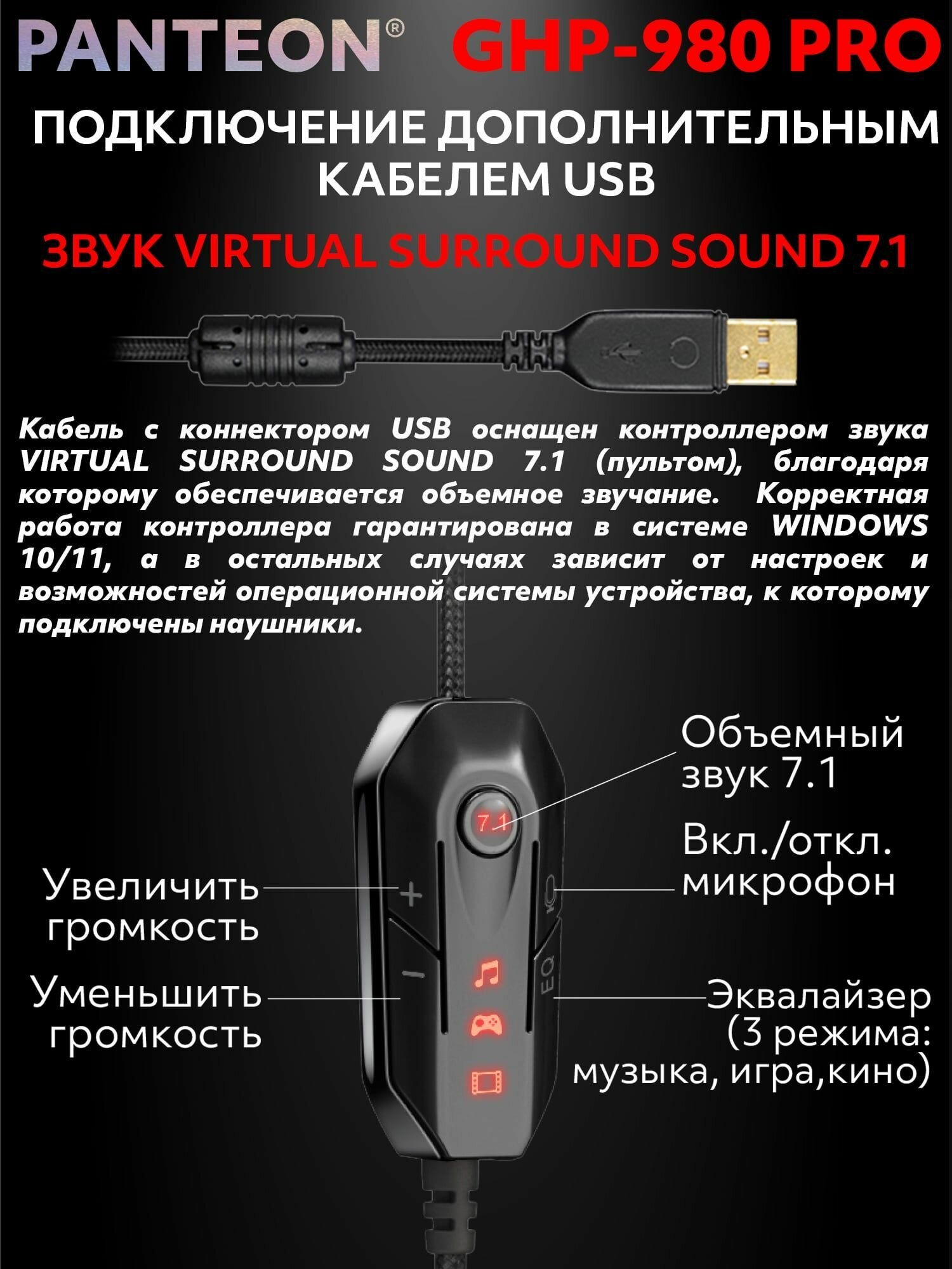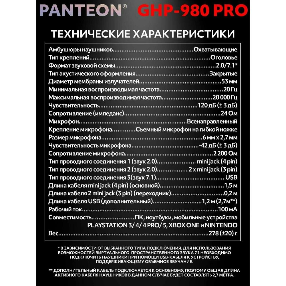 Наушники PANTEON GHP-980 PRO оснащены 53-миллиметровыми динамиками, которые выдают глубокий, чистый, насыщенный звук. Четкое позиционирование звука в пространстве благодаря контроллеру виртуального объемного звука SURROUND SOUND 7.1 и максимально облегченная конструкция корпуса делают их оптимальным выбором как для профессиональных геймеров, так и для меломанов. Легкая конструкция, мягкое оголовье и увеличенные комфортные амбушюры гарантируют отсутствие усталости при длительном использовании. Гарнитура PANTEON GHP-980 PRO поддерживает 3 различных типа подключения: mini jack 4 pin / 2 x mini jack 3 pin / USB. Благодаря этому ее можно подключить к мобильным телефонам, планшетам, игровым приставкам, ноутбукам и персональным компьютерам. На дополнительном кабеле с коннектором USB расположен контроллер виртуального объемного звука SURROUND SOUND 7.1. Чувствительный всенаправленный микрофон обеспечивает отличную передачу голоса. Гибкая ножка помогает установить микрофон в максимально удобное положение. Съемная конструкция микрофона позволяет отсоединить его в любой момент. Подключение основным кабелем MINI JACK 4 PIN 3,5 ММ Подключение к PLAYSTATION 3/ 4/ 4 PRO/ 5, XBOX ONE и NINTENDO, мобильным устройствам и ноутбукам, оснащенным соответствующим разъемом. Подключение С переходником 2 х MINI JACK 3 PIN 3,5 ММ Подключение к стандартным аудио- и микрофонному разъемам персонального компьютера. Подключение дополнительным кабелем USB Дополнительный кабель с коннектором USB оснащен контроллером звука VIRTUAL SURROUND SOUND 7.1 (пультом). Кабель позволяет подключать наушники к игровым приставкам PLAYSTATION 3/ 4/ 4 PRO/ 5, ноутбукам, персональным компьютерам, оснащенным USB-разъемом.
