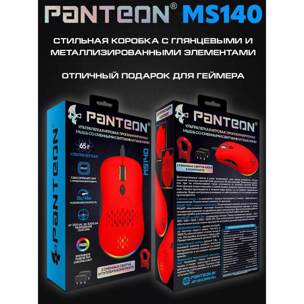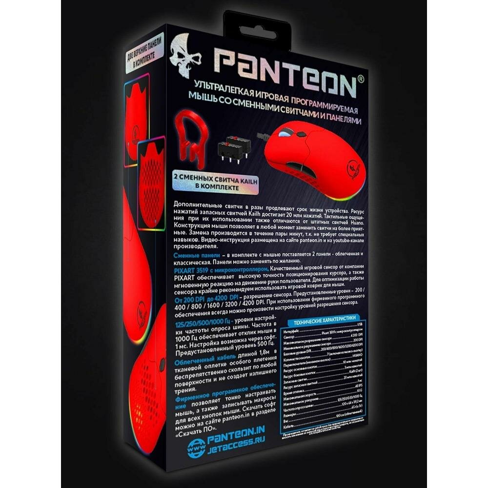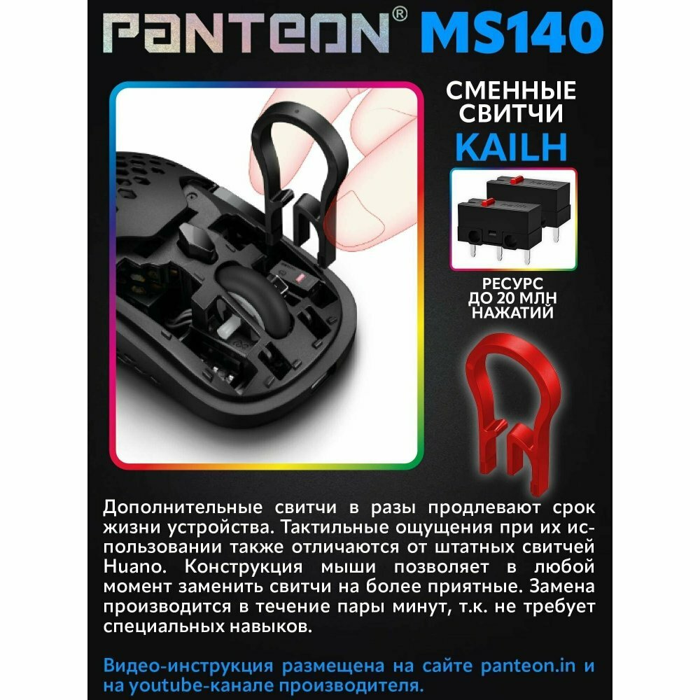 Дополнительные свитчи в разы продлевают срок жизни устройства. Ресурс нажатий запасных свитчей Kailh достигает 20 млн нажатий. Тактильные ощущения при их использовании также отличаются от штатных свитчей Huano. Конструкция мыши позволяет в любой момент заменить свитчи на более приятные. Замена производится в течение пары минут, т. к. не требует специальных навыков. Видео-инструкция размещена на сайте panteon.in и на youtube-канале производителя. Сменные панели – в комплекте с мышью поставляется 2 панели - облегченная и классическая. Панели можно заменять по желанию. PIXART 3519 с микроконтроллером. Качественный игровой сенсор от компании PIXART обеспечивает высокую точность позиционирования курсора, а также мгновенную реакцию на движение руки пользователя. Для оптимизации работы сенсора крайне рекомендуем использовать игровой коврик для мыши. От 200 DPI до 4200 DPI – разрешение сенсора. Предустановленные уровни – 200 / 400 / 800 / 1600 / 3200 / 4200 DPI. При использовании фирменного программного обеспечения всегда можно произвести настройку уровней разрешения сенсора. 125/250/500/1000 Гц - уровни настройки частоты опроса шины. Частота в 1000 Гц обеспечивает отклик мыши в 1 мс. Настройка возможна через софт. Предустановленный уровень 500 Гц. Облегченный кабель длиной 1,8м в тканевой оплетке особого плетения беспрепятственно скользит по любой поверхности и не создает излишнего трения. Фирменное программное обеспечение позволяет тонко настраивать мышь, а также записывать макросы для всех кнопок мыши. Скачать софт можно на сайте panteon. in в разделе «Скачать ПО».