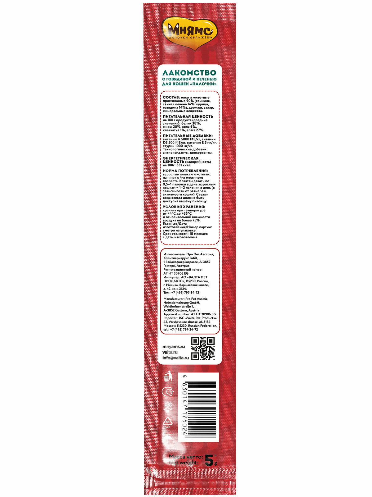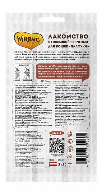 Мнямс лакомые палочки с говядиной и печенью – отличный выбор для вашей кошки. Мягкие палочки изготовлены из высококачественного натурального сырья и подходят для кормления котят с 4-х месяцев.