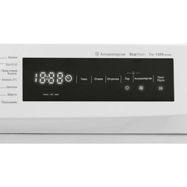 - Вместительный барабан на 7 кг, бесщёточный двигатель, бесшумная работа, обработка паром вещей, удобная панель пользования.