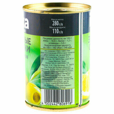 | Состав | Зеленые оливки, вода, паста из лосося (лосось, вода, загуститель Е401), соль, усилитель вкуса и аромата Е621, Е635, регулятор кислотности лимонная кислота, антиокислитель аскорбиновая кислота |