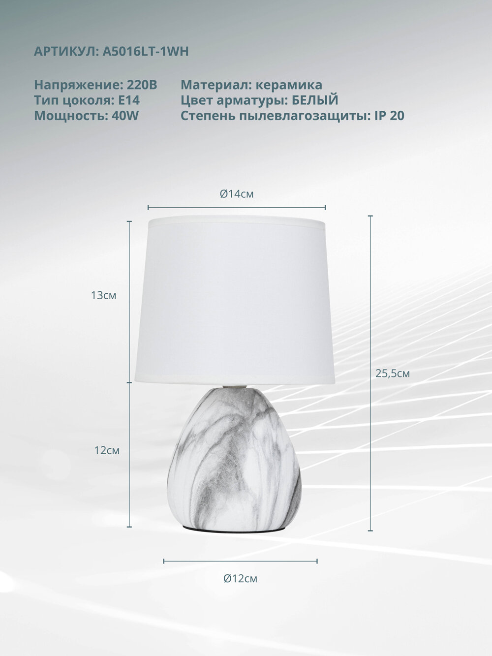 Декоративная настольная лампа A5016LT-1WH серии WURREN в классическом стиле. Подчеркнет стиль помещения. Высота 25 cm. Диаметр 16 cm Параметры пылевлагозащиты IP — 20. Форма декоративная. Плафон текстильный белого цвета, а материал/цвет арматуры керамика/белый. Использует лампу с цоколем E14. Площадь освещения охватывает 1 m?. Идеально подходит для гостиной или спальни. Страна происхождения бренда — Италия.