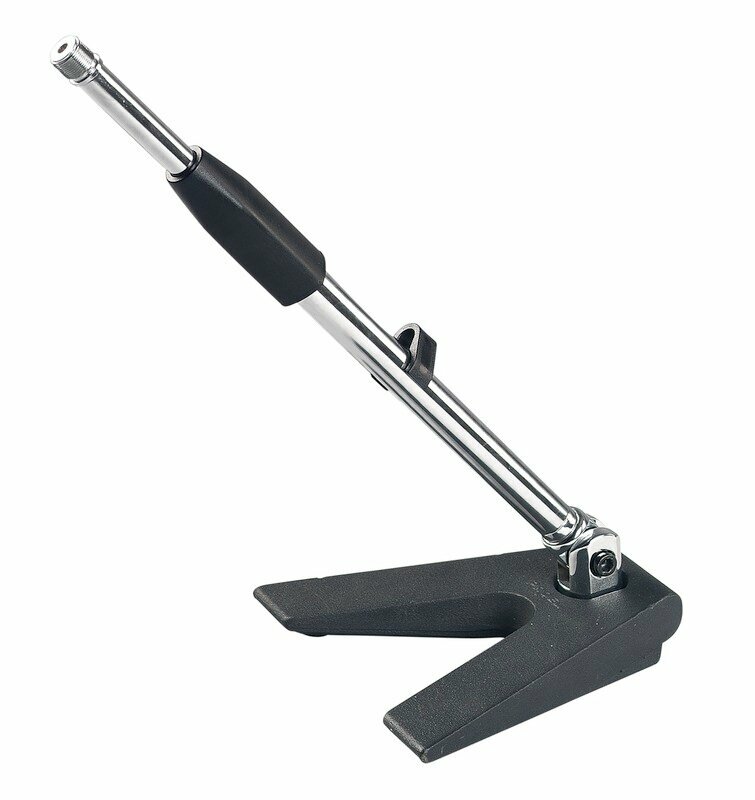 Для удобства регулировки угла наклона и длины стрелы есть специальный пластиковый держатель. Для протягивания провода предусмотрено крепление, установленное на оси стойки. В основании подставки есть прорезиненные ножки, способствующие прочной постановке на горизонтальную поверхность и препятствующей скольжению. Производителем является компания Proel, специализирующаяся на изготовлении стоек, аксессуаров для сценического оборудования.