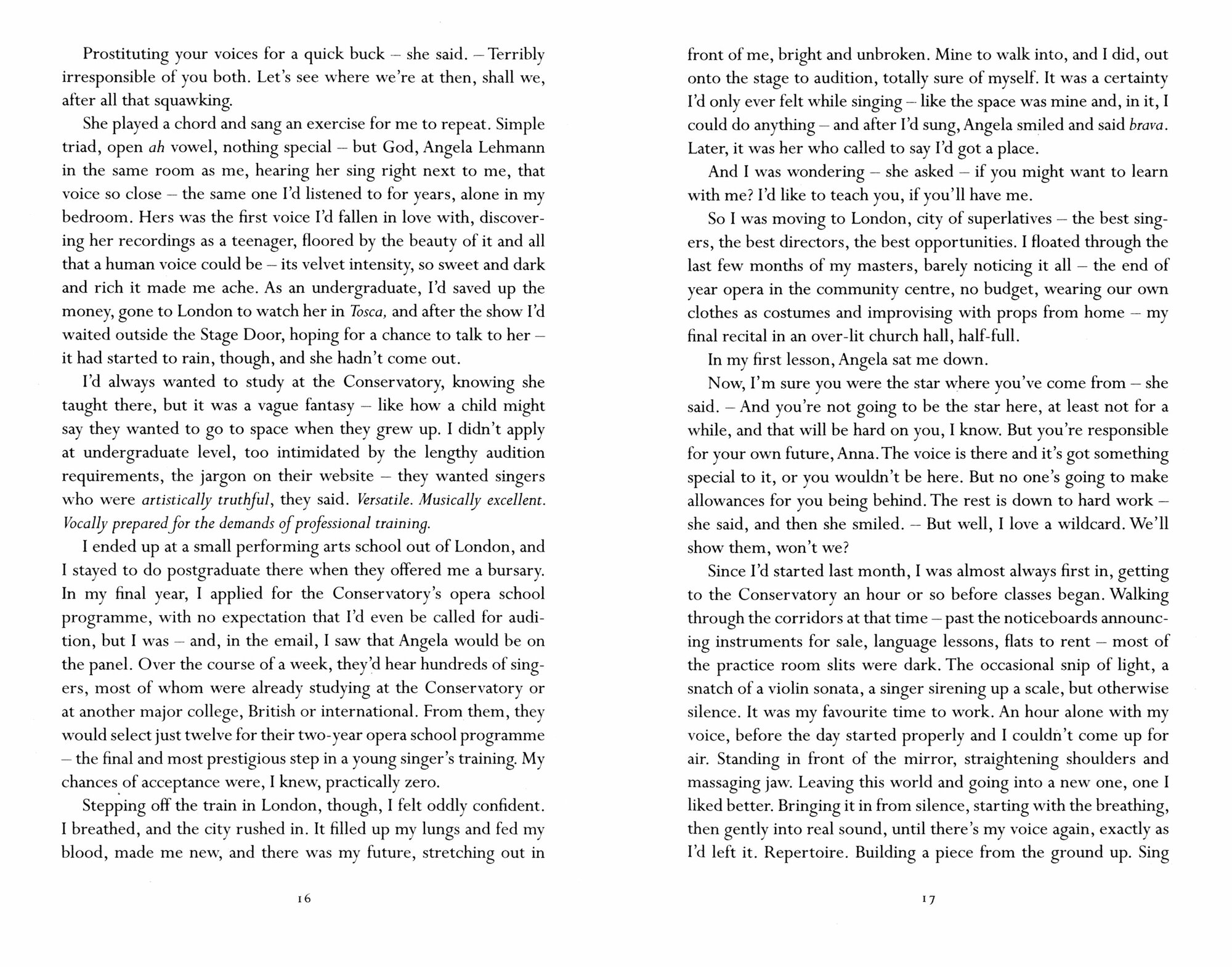 Anna is struggling to afford life in London as she trains to be a singer. During the day, she vies to succeed against her course mates with their discreet but inexhaustible streams of cultural capital and money, and in the evening she sings jazz at a bar in the City to make ends meet.