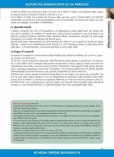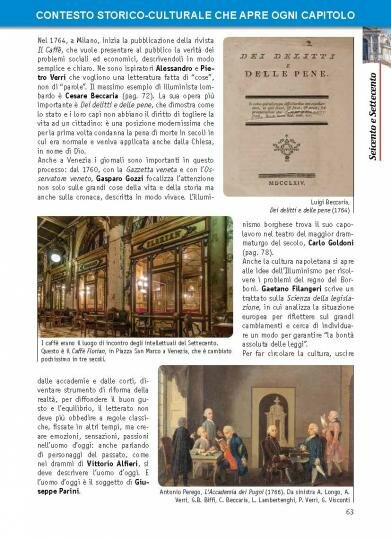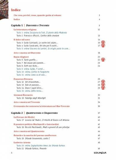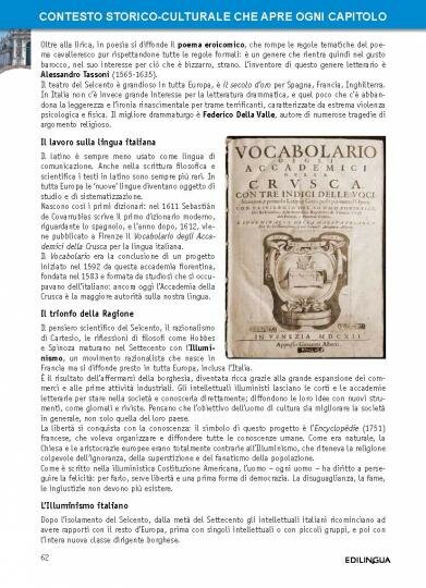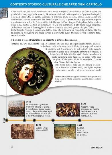 Il volume, che ha in allegato un CD audio, e organizzato in otto capitoli, otto moduli, e in ciascuno viene presentato un periodo e alcuni autori con le loro opere. Troviamo inoltre delle schede sull’arte e la musica e, dal Novecento, delle schede anche sul cinema e la canzone d’autore.