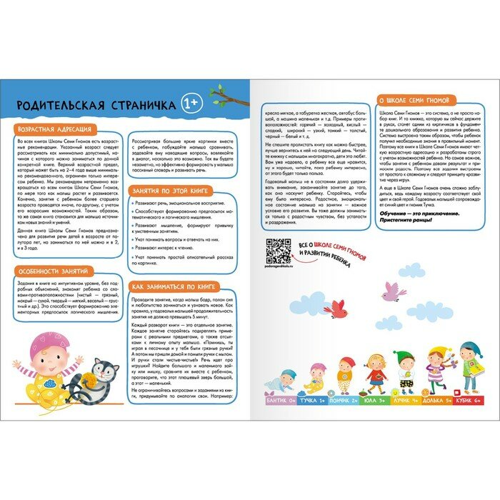 Система выстроена таким образом, чтобы ребёнок получил необходимые знания в правильный момент. Поэтому все книги в Школе Семи Гномов имеют четкую возрастную адресацию и разработаны строго с учетом возрастных возможностей ребенка. Но самое важное, чтобы занятия с ребенком давали результат и приносили радость. Поэтому все задания выстроены от простого к сложному и следуют принципу «развитие через игру». Заниматься с ребенком может любой взрослый, специальных знаний и опыта не требуется. Родительская страничка в каждой книге подскажет, что, как и почему нужно развивать в данном возрасте.