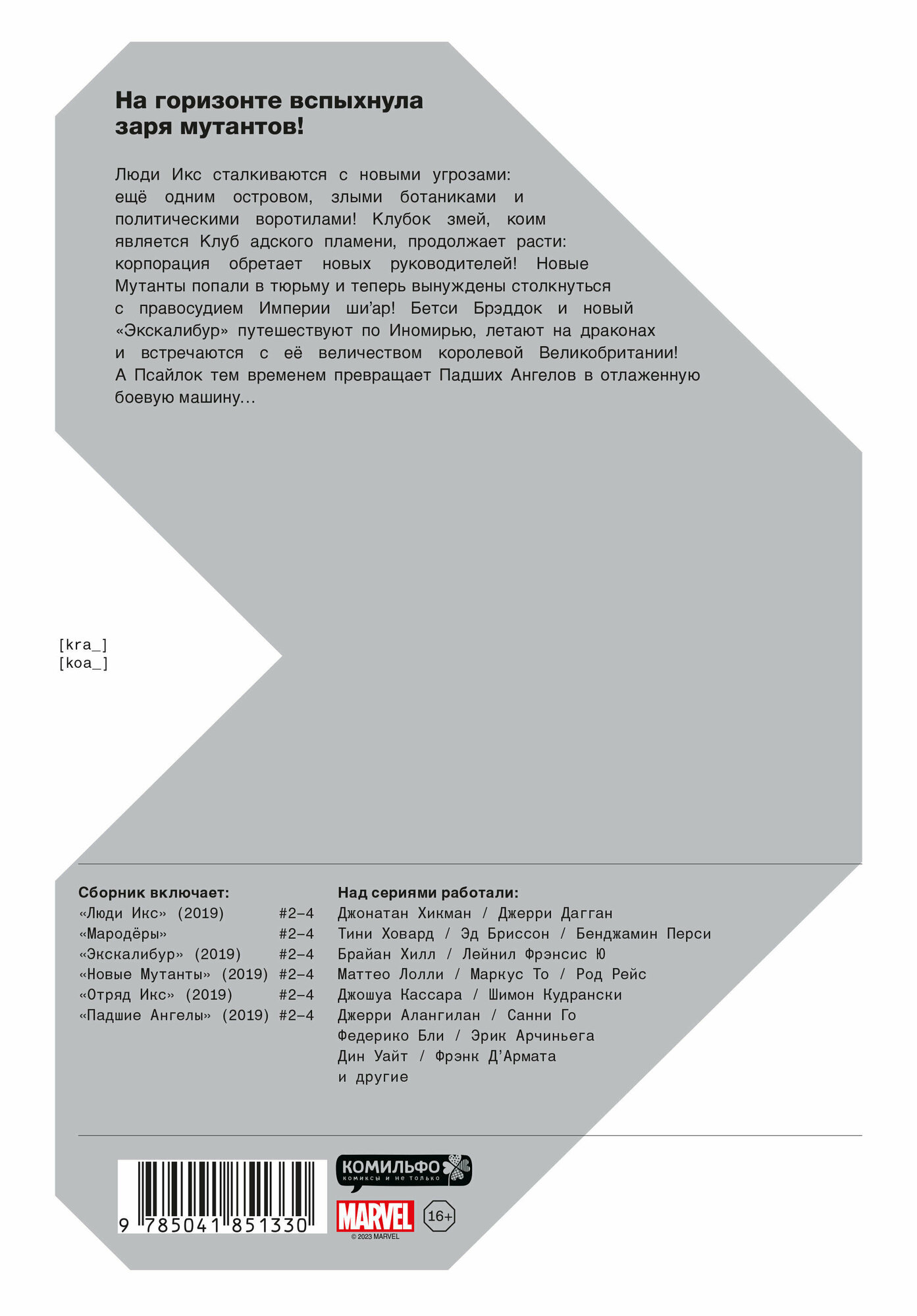Сборник включает: «Люди Икс» (2019) #2–4, «Мародёры» #2–4, «Экскалибур» (2019) #2–4, «Новые мутанты» #2–4, «Отряд Икс» #2–4, «Падшие Ангелы» #2–4.