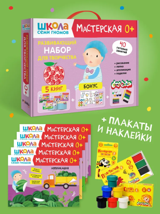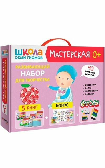 «Развивающий набор для творчества 0+» — это 40 готовых занятий для ребенка от рождения до года. В Мастерской собраны все основные виды творческой деятельности, доступные малышу: лепка, рисование, аппликация, поделки, а также необходимые материалы: пластилин, восковые карандаши и краски. Кроме того, внутри набора ждет приятный бонус — большой плакат (70Х50 см) для раскрашивания пальчиками, разработанный в соответствии с возрастными возможностями ребенка, обучающий плакат «Арифметика цвета» и поощрительные наклейки.